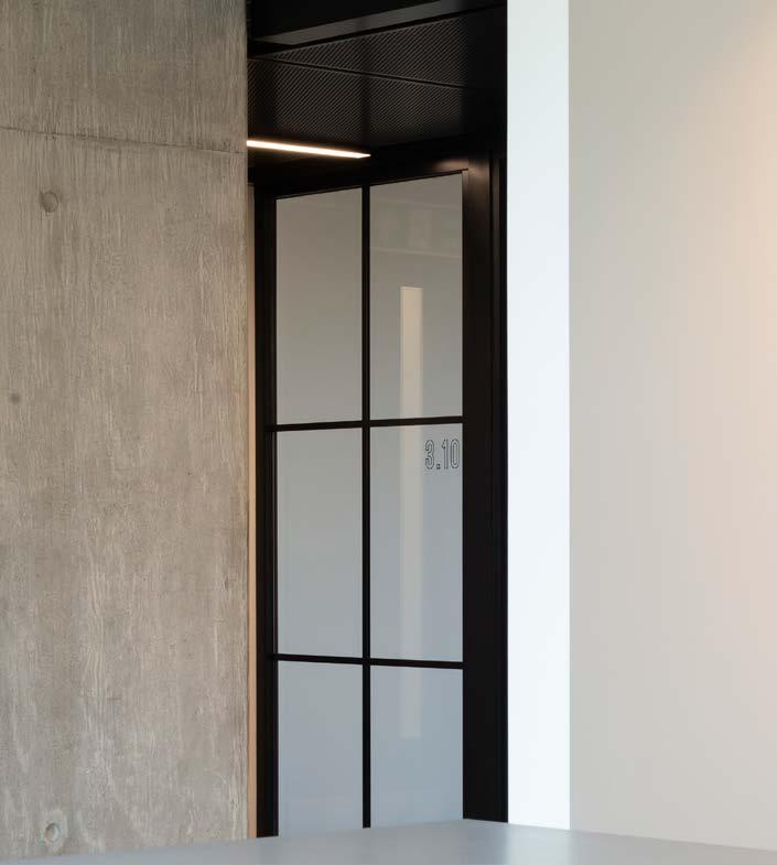 The top two floors of the building are set back and feature twisted dark grey perforated aluminium fins, which reference the historical textile manufacturing history of the neighbourhood and provide solar shading.