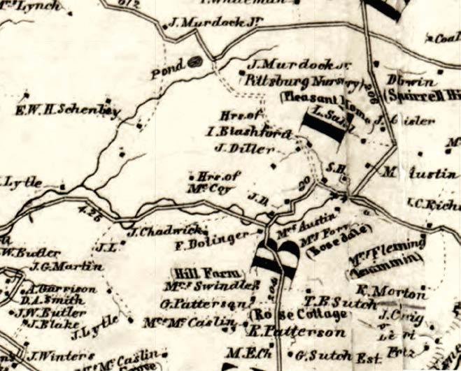 Detail from 1862 map of Allegheny County with black squares indicating log cabins in Squirrel Hill. The black square above the second ‘e’ in E.W.H. Schenley is the Neill Log House. Historic Pittsburgh http://digital.library.pitt.edu/maps