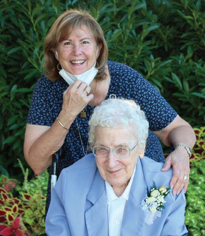 Catholic School (now Saint John Paul II Catholic School), the first Catholic school in Citrus County, Florida. She acted as an influential educator and principal until 1990 when she became the director of development for two years. The school began with 50 students in three grades and added a grade each year; it continues to thrive today serving more than 150 students from pre-K to 8th grade. From 1991 until 2007, S. Mary Loyola served as education coordinator and Rite of Christian Initiation of Adults (RCIA) director at St. Scholastica Associate Jane Burdette (back) enjoyed a visit with S. Mary Loyola Mathia on her 100th Church in Lecanto, Florida. In birthday on Sept. 14, 2021. May 2007 she began ministering at St. Francis Cabrini Xavier Church in Springhill, Florida. There she oversaw the RCIA program and annulments. Throughout her years at both St. Scholastica and St. Francis Cabrini she got to know many parishioners; her dynamic personality and deep faith were contagious and as those relationships developed, she walked with many as they chose to make commitments as Associates in Mission of the Sisters of Charity. upon her 70th anniversary with the Community, Florida Associate Rachel edwards said, “I see the charity, humility and simplicity that comes from her very soul. We feel privileged to know and love S. Loyola, as she continues to mentor all of ‘her’ Associates.” Associate Jane Burdette recalls meeting S. Mary Loyola and their relationship that followed: “I met S. Loyola around 1993 when she was at St. Scholastica. I was raised Southern Baptist but had always felt called to the Catholic faith. I had no idea where to start my journey but was directed, quite by chance, to Father Tom Morgan. It just so happened that S. Loyola was in charge of RCIA. The first time I met her we had a good laugh and I knew she was special. My family owns a Papal Indulgence so I took a copy with me to her class and told her I was grandfathered in. She thought it was hilarious … Sister has a great sense of humor and we have had many more laughs and adventures over the years. Of course, there were some bumps in my road to the faith. My family was not on board with my choice so I remained a catechumen for about eight years before all was sorted out and resolved. S. Delia Sizler (left) was a student of S. Mary Loyola Mathia’s at Holy Name High School in Cleveland, Ohio. In the meantime, S. Loyola would lift me up whenever I got