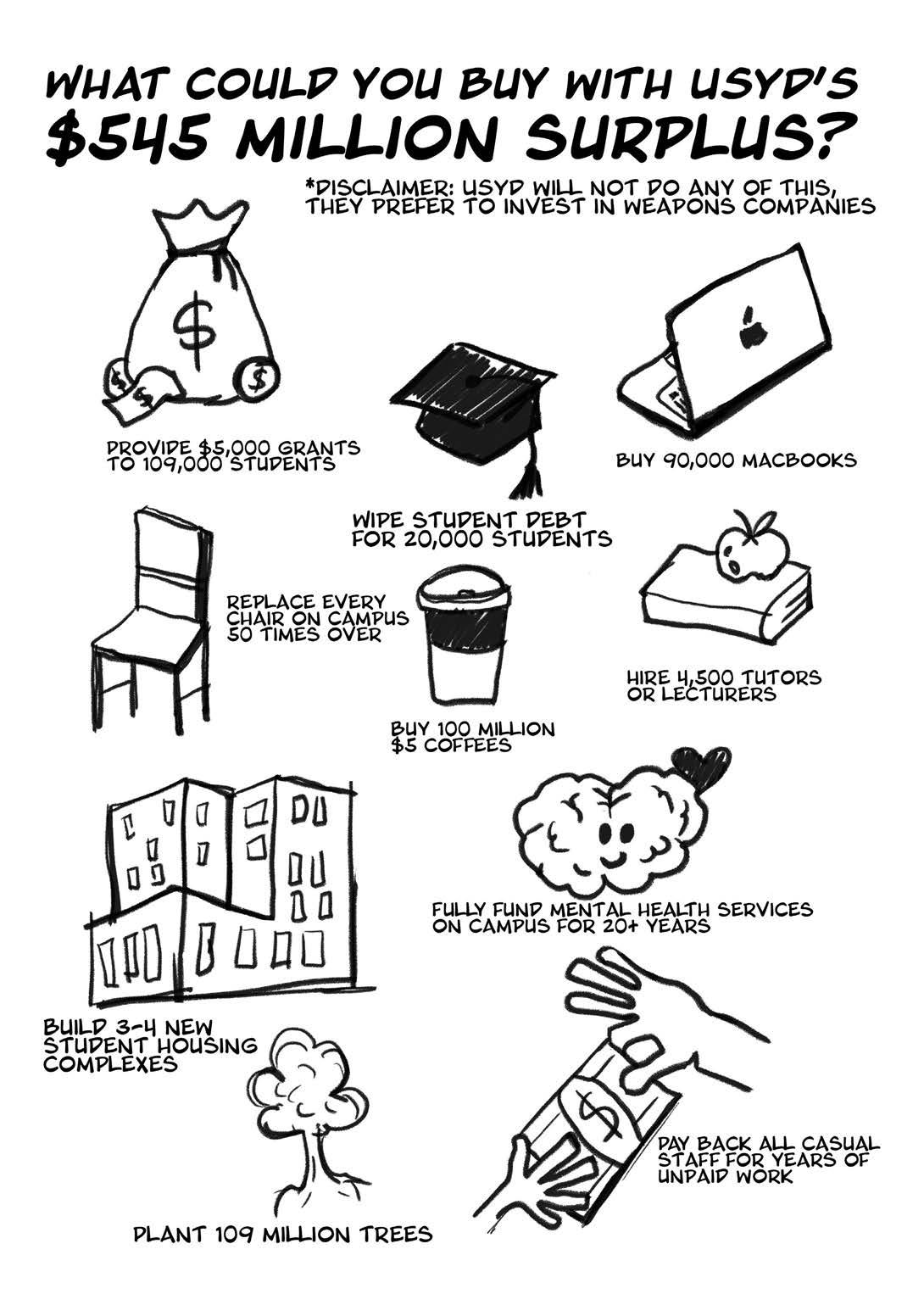 The University of Sydney has had several years of uninterrupted profits, with the uni recording a budget surplus of $550 million dollars in the 2024–2025 business year. Our Vice Chancellor Mark Scott just gave himself a $150,000 pay rise, fattening his annual salary to over $1.3 million. And as of 2023, Australian universities had roughly $110.8 billion in total assets. There are no excuses for sky-high student accommodation costs, course cuts or staff cuts when universities are sitting on a pool of cash and assets.