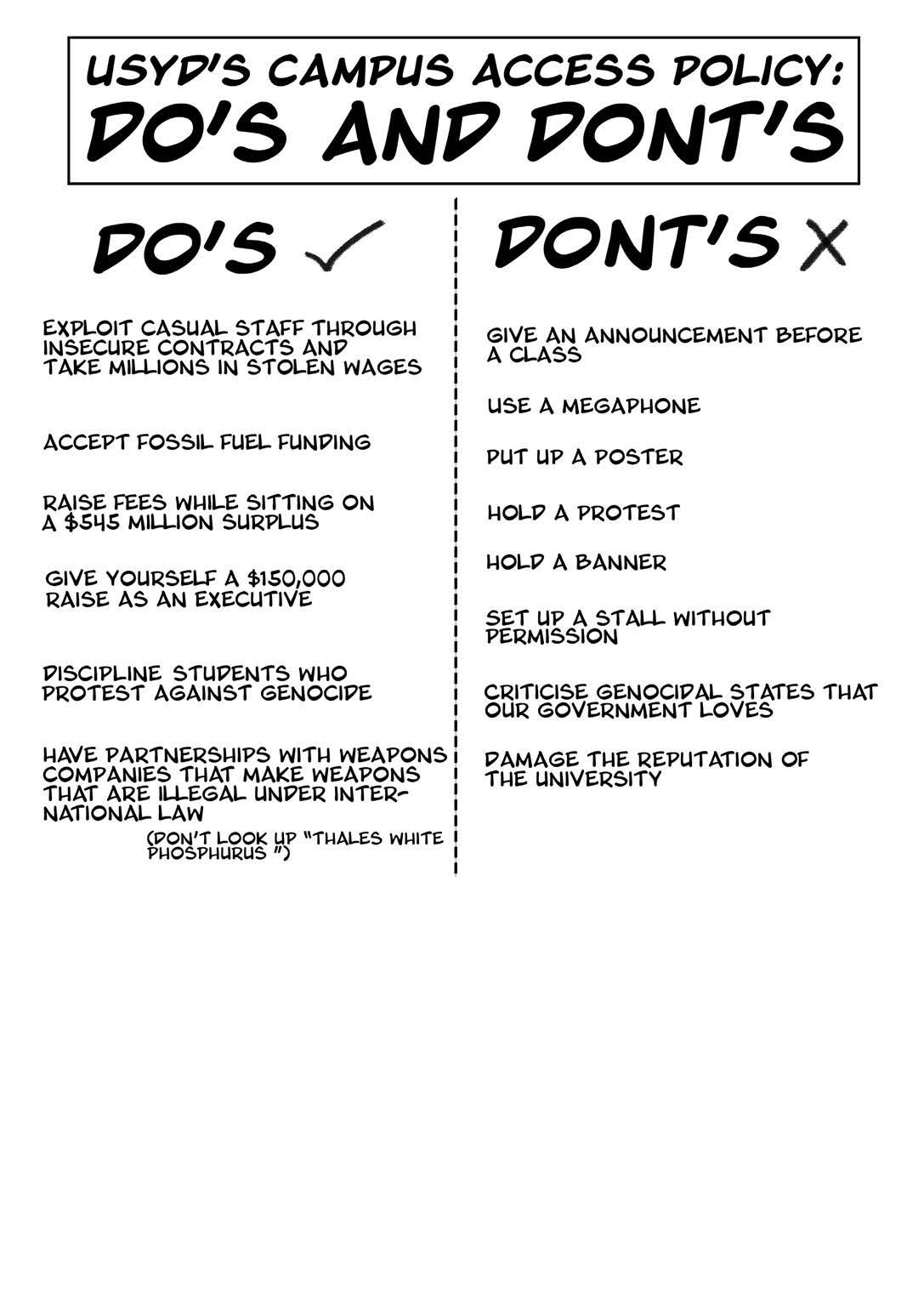 What has followed is a severe crackdown on political expression. At USyd, Palestine flags have been ordered removed from people’s offices. A transgender student was almost suspended and thus risked deportation for writing pro-Palestine slogans on a whiteboard. Students have received emails threatening disciplinary action for organising protests, speaking at rallies, and even running bakesales fundraising for Palestinian families in Gaza. The content and placement of posters and signs must now be authorised by the University under a new policy.