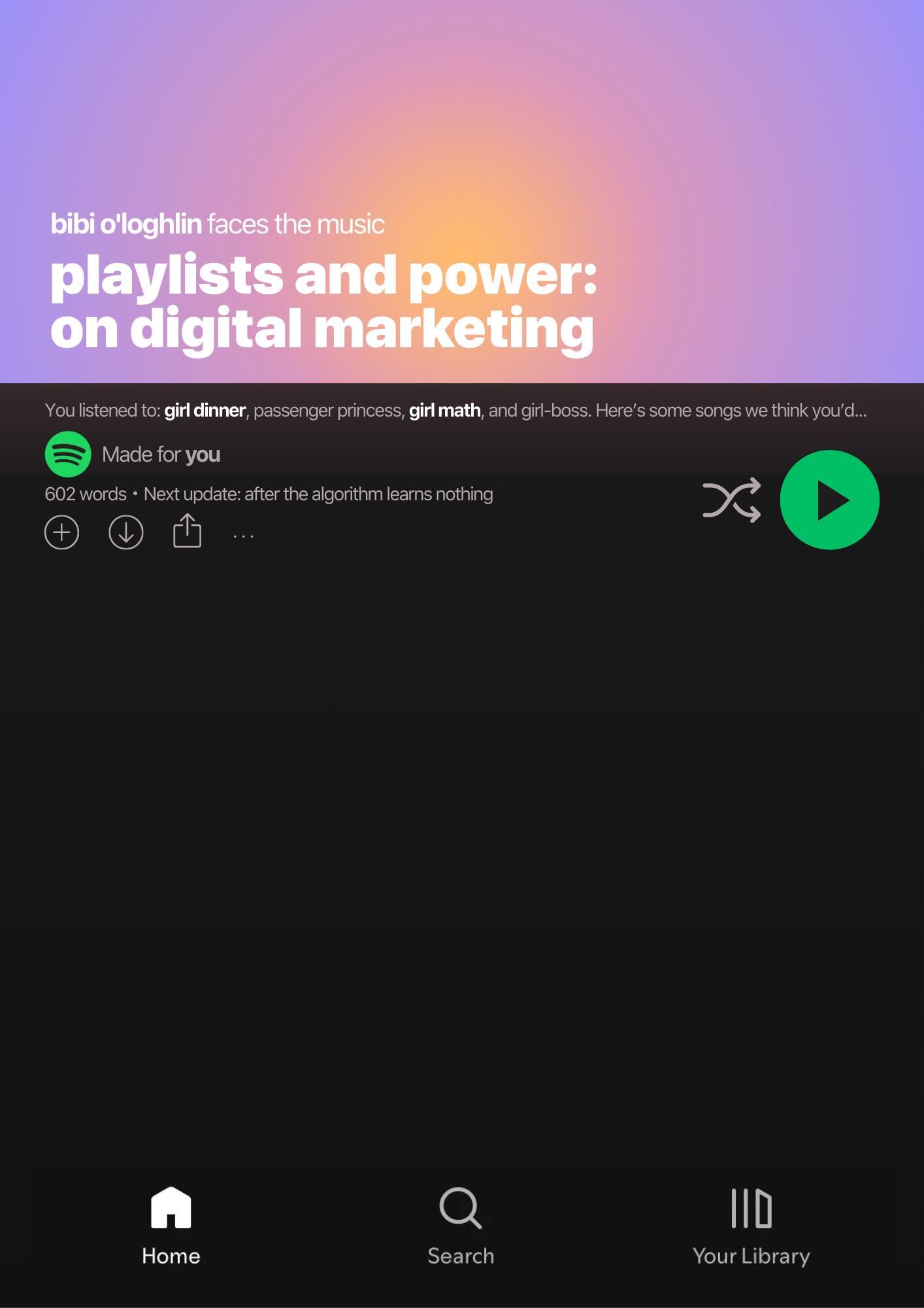 The first question that came to mind: how on earth can ‘girl dinner’ qualify as a music genre? The second: what is Spotify trying to tell me about myself by feeding me that content?