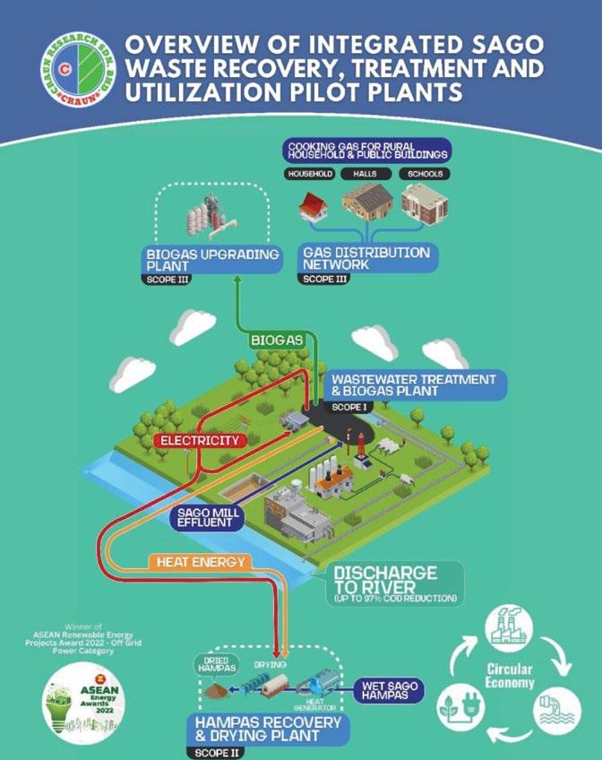 In the article, “Mukah Sago Waste treatment Pilot Plant: A Sustainable Solution to Sago Wastes” by Craun Research Sdn. Bhd., the author presents ongoing large-scale efforts in converting processed crop waste (sago residue) into bioenergy. The author also introduces the anaerobic pond, a fascinating facility that transforms sago waste into biogas, serving as a clean energy source for electricity generation. This treatment plant has successfully enhanced the circular economy of the sago industry.