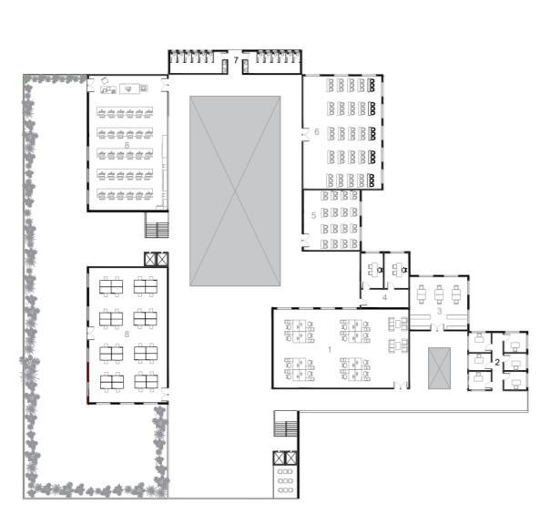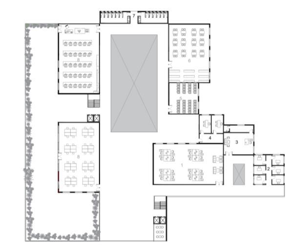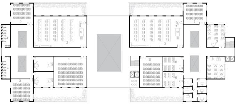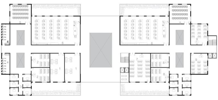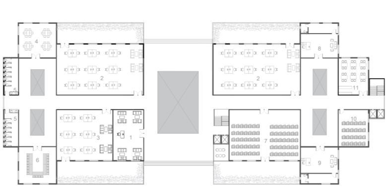 An atrium with amphitheater helps in interaction among students of various departments and focusing on the individuality of the departments