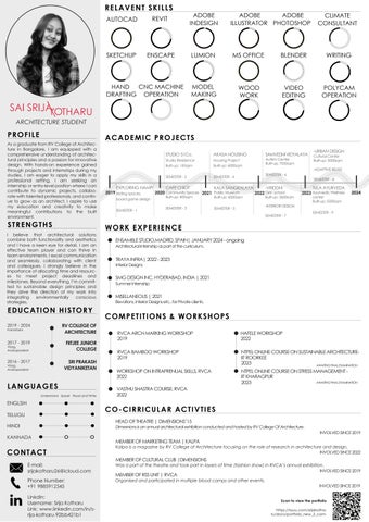 I'm a graduate from RV College of Architecture in Bangalore, with hands-on experience gained through projects and internships during my studies, I am eager to apply my skills in a professional setting. I aspire to use my education and creativity to make meaningful contributions to the built environment.