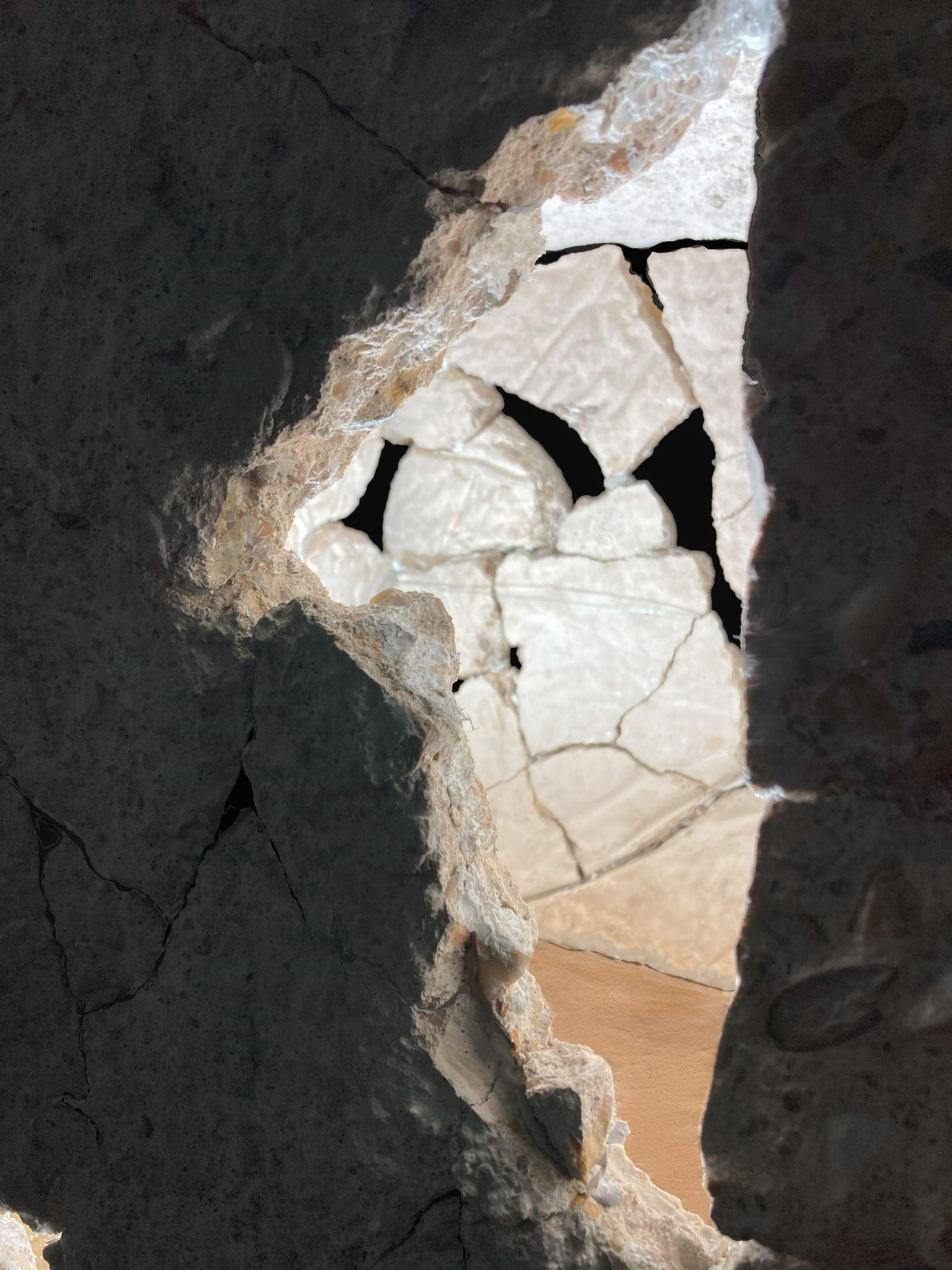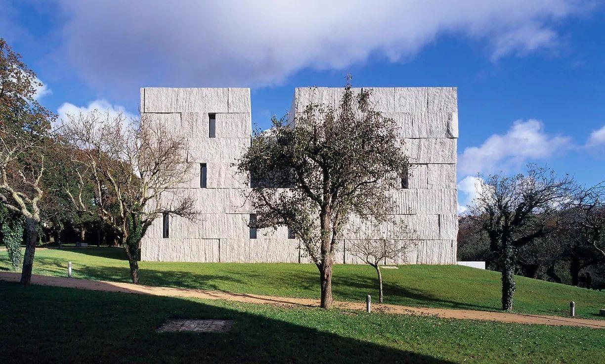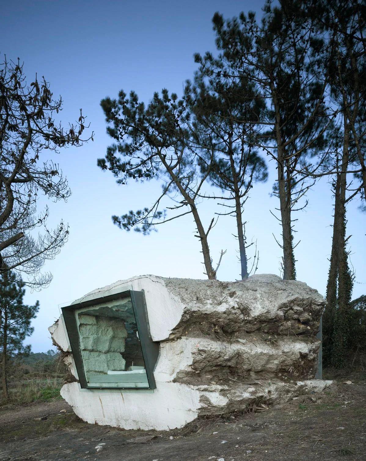I doubt if the energy was captive within the volume and exhaled outside, or if, on the contrary, this dense and contained space breathedduetothepressurethatthebeautiful exteriorlandscapeexertstowardsitsinterior.A fissured mass, always expressing age and the Pyrenees, with its cracked peaks, enters the interior through the interstices of the wall. Inside, is a domesticated plane with a tree in thecenterasahearth flame,andshelterinthe mountains.
