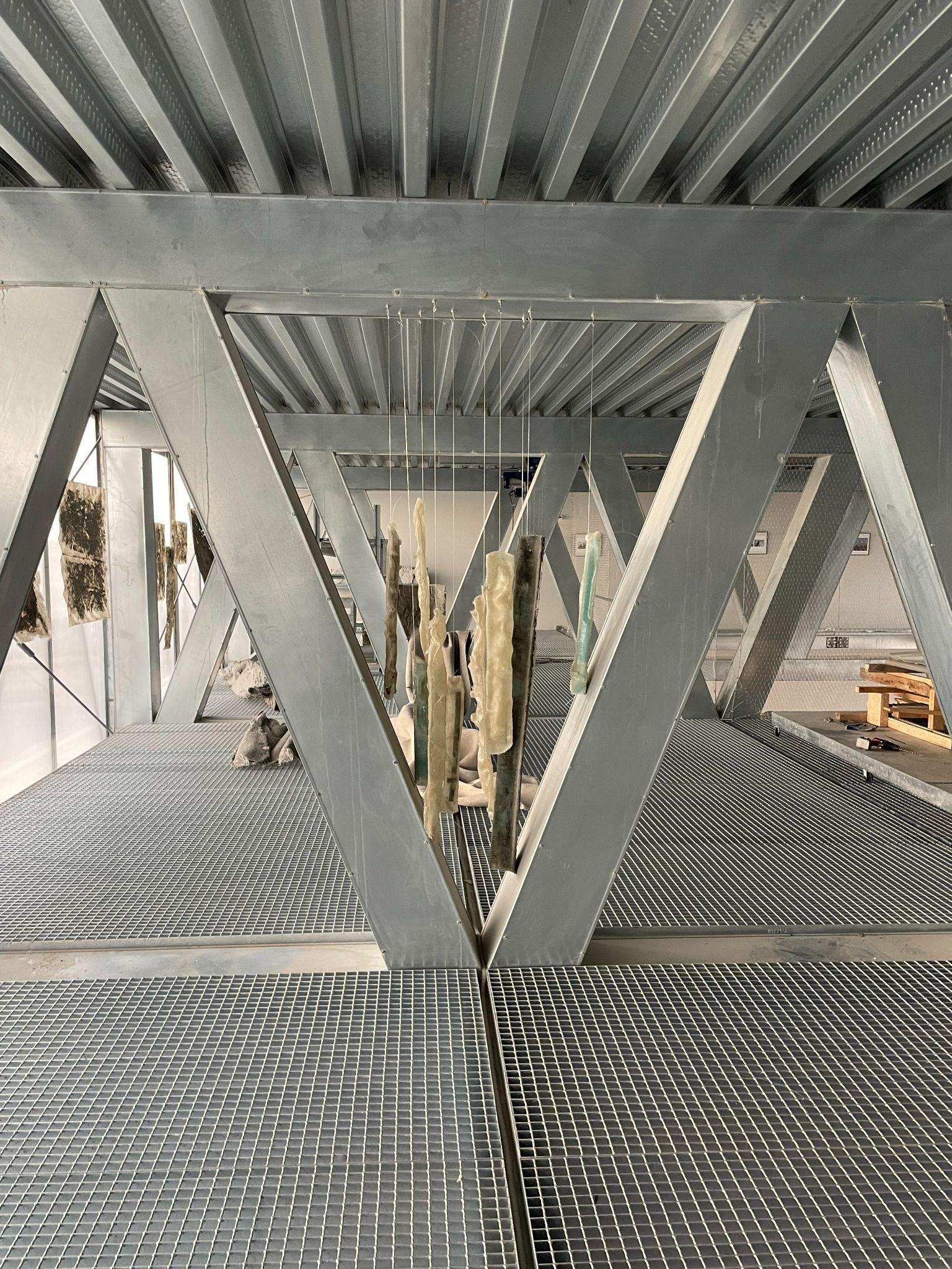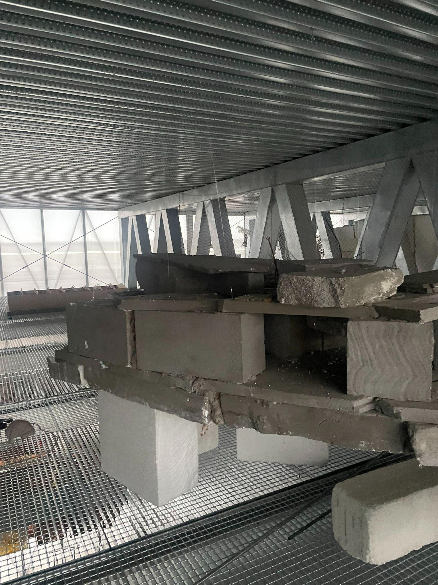 STEP4:Thenweverticallyliftedthedirtwallup andtiedthecablesfromthegalleryfloorand securedthewireswiththehelpofcableclamps makingsurethewireswereintensionandthe dirtwallwassupportedfrom2sidesinorderto suspendittorestonthelabfloor.