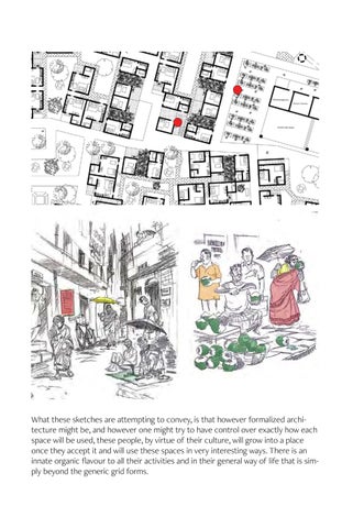 What these sketches are attempting to convey, is that however formalized architecture might be, and however one might try to have control over exactly how each space will be used, these people, by virtue of their culture, will grow into a place once they accept it and will use these spaces in very interesting ways. There is an innate organic flavour to all their activities and in their general way of life that is simply beyond the generic grid forms.