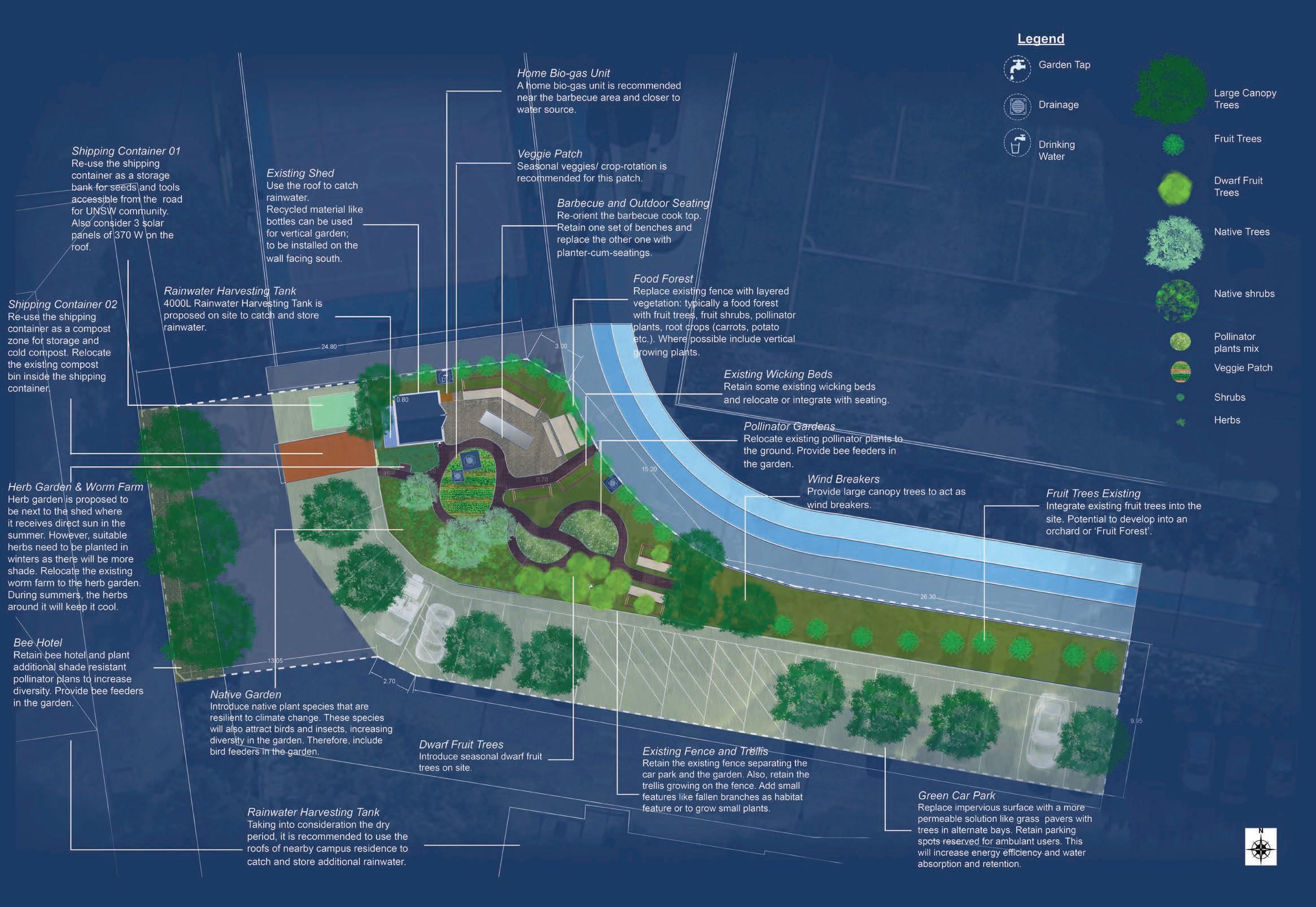 “Urban Garden is a vision and direction for the community garden at UNSW. Permaculture principles are implemented to re-design the space. The proposed design reflects the key permaculture principles of CATCH AND STORE ENERGY, BRING FOOD PRODUCTION BACK TO THE CITIES, VALUE DIVERSITY, PRODUCE NO WASTE, and OBTAIN A YIELD mainly. However, it also incorporates Observe and Interact, Problem is the Solution, Use biological Resources and Solutions, Co-operate don’t compete as well.”