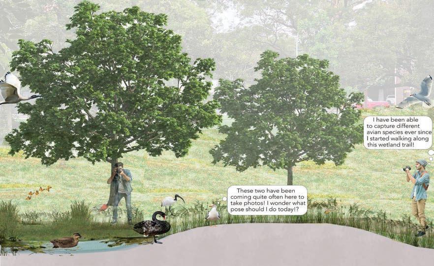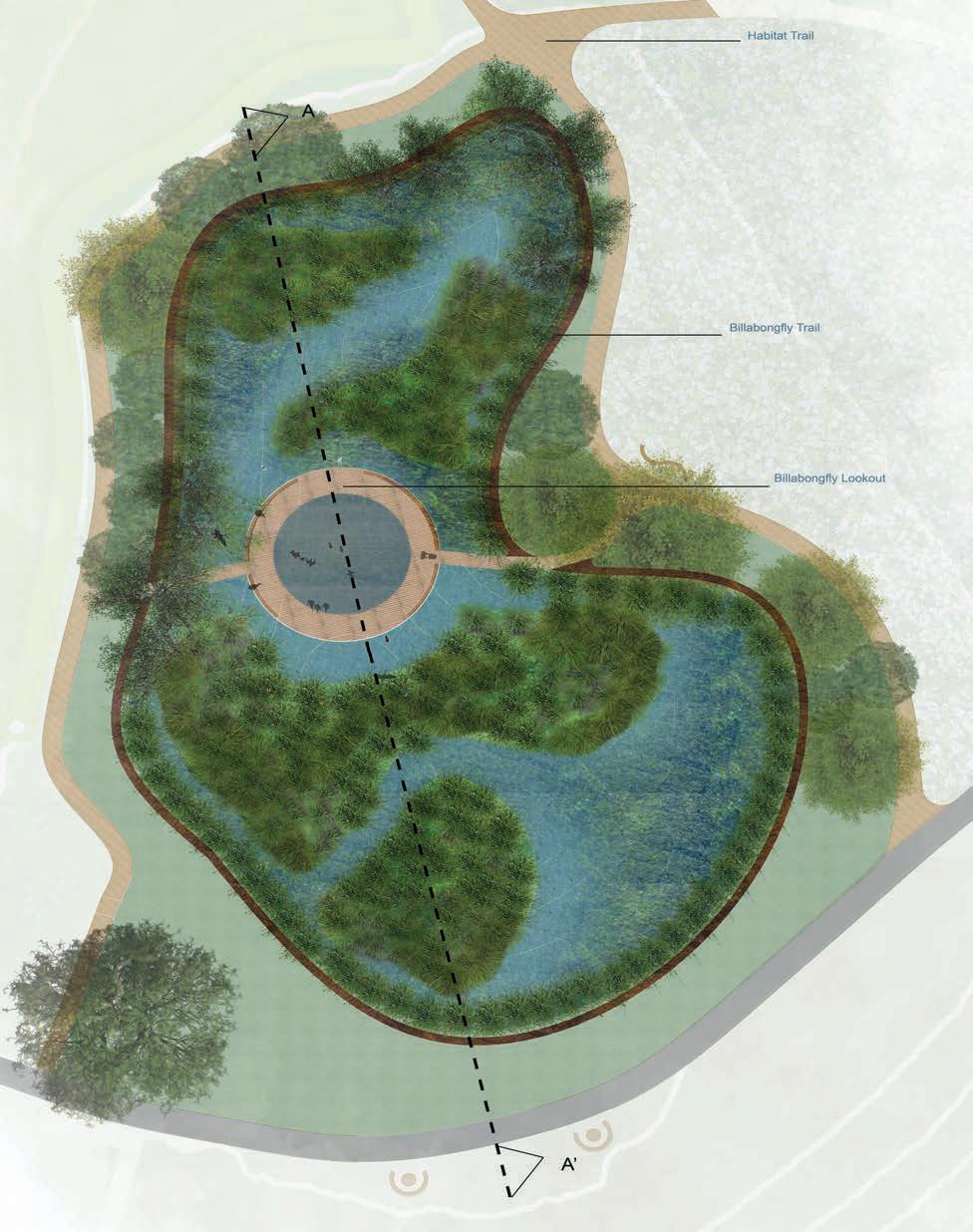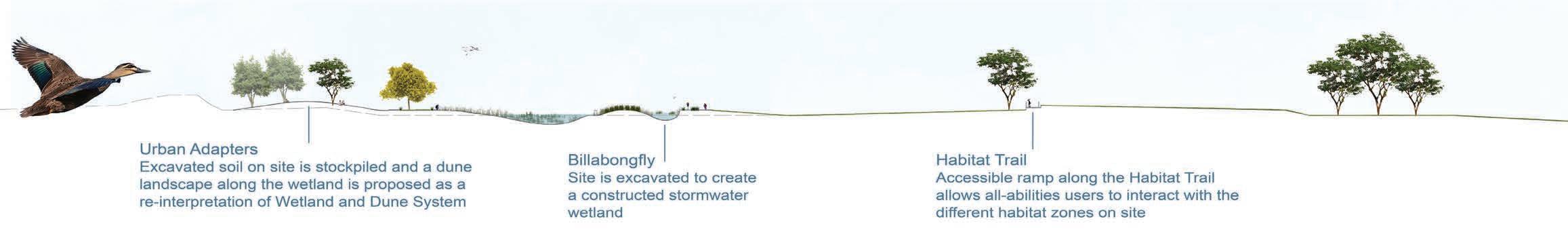 Creating a sense of place for Avian Species, Billabongfly encourages Citizen Science initiatives along the trails as well as the lookout. The low points on the site combined with the existing stormwater drains running parallel to the site, allow this wetland to function as a stormwater wetland.