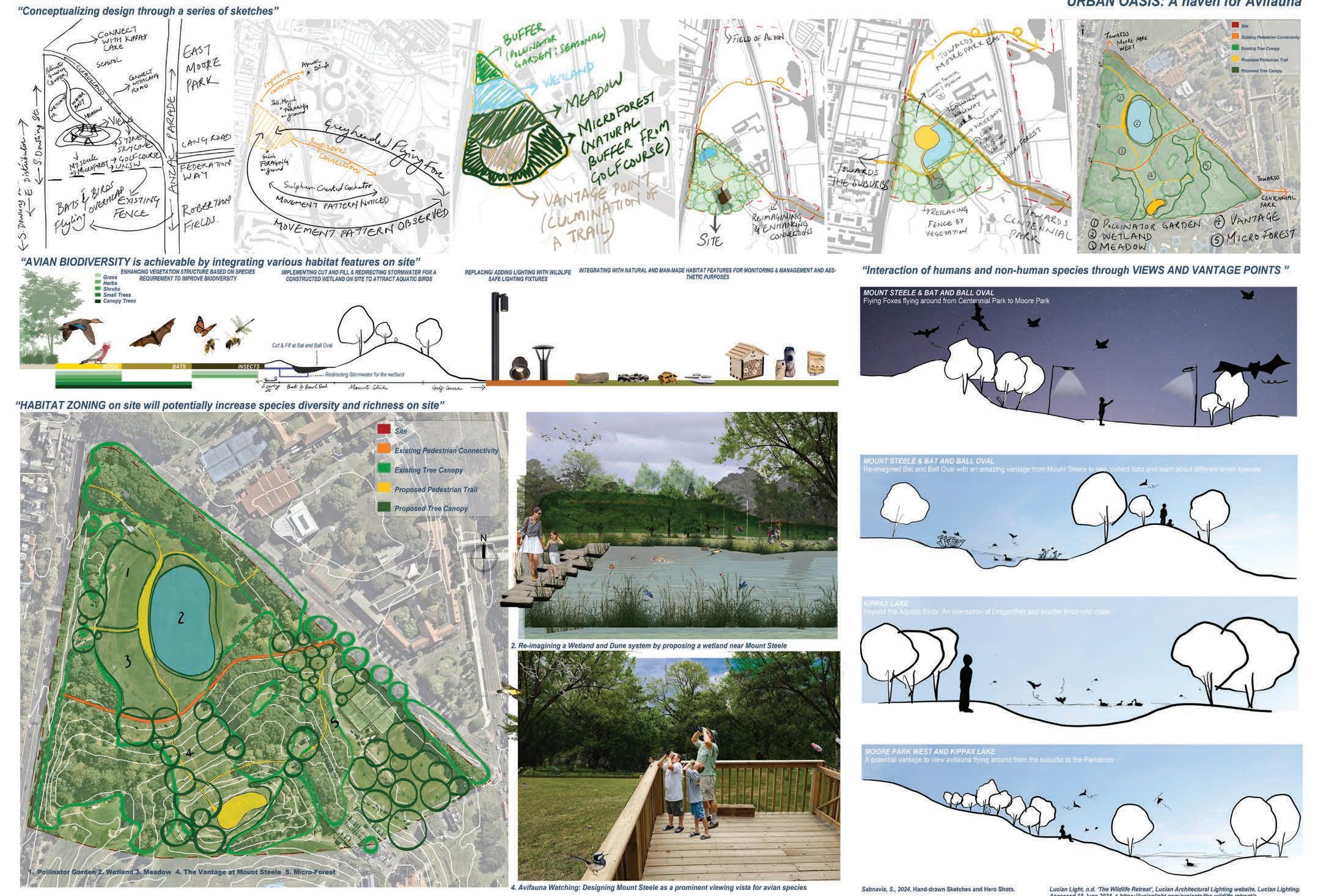 “Urban Oasis is a vision and direction for Moore Park to enhance Avian Biodiversity by introducing habitat features and re-interpreting the ‘Wetland and Dune’ landscape. The project includes trails culminating at Mount Steele for panoramic views, vegetation and wetland area with mulch, tree logs and owl poles to support avian species. Lookout areas and a smaller trail for citizen scientists provide educational and experiential opportunities. Community engagement through workshops, volunteer programs, and educational initiatives is a key aspect, promoting habitat management and environmental stewardship.”