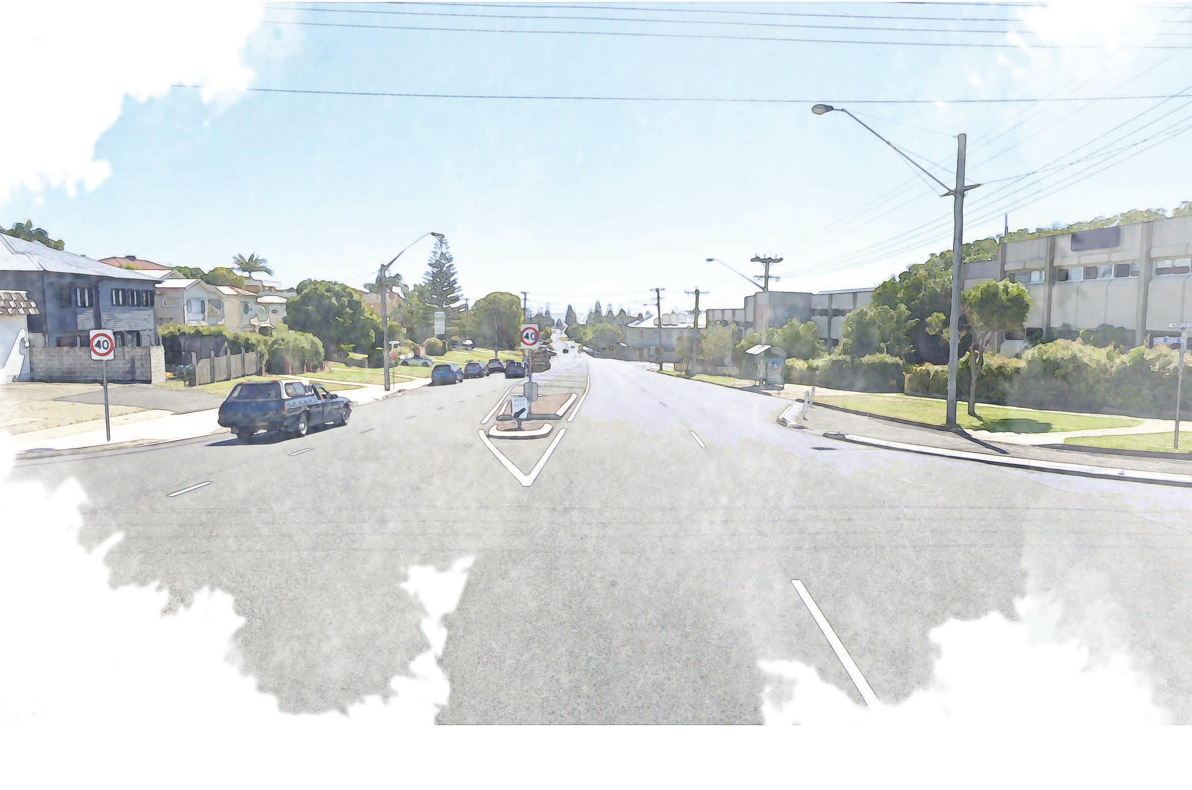 Replacing the Power line structure with only a street light and providing a street tree near bus stop will enhance the user experience and provide a comfortable waiting for the users. In the next 15 years, the median can be wider by providing minimum lane width of 3.0 m for one lane.