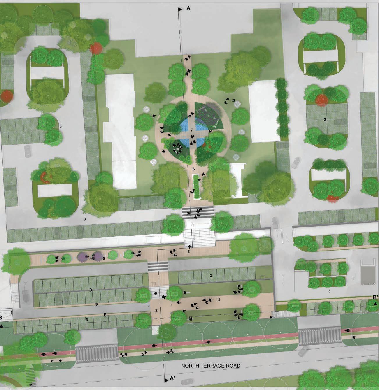 Site condition: Due to the dense urban fabric, Salt Pan Creek has been converted into concrete channel and is no longer visible towards the Northern end, i.e., along the North Terrace.
