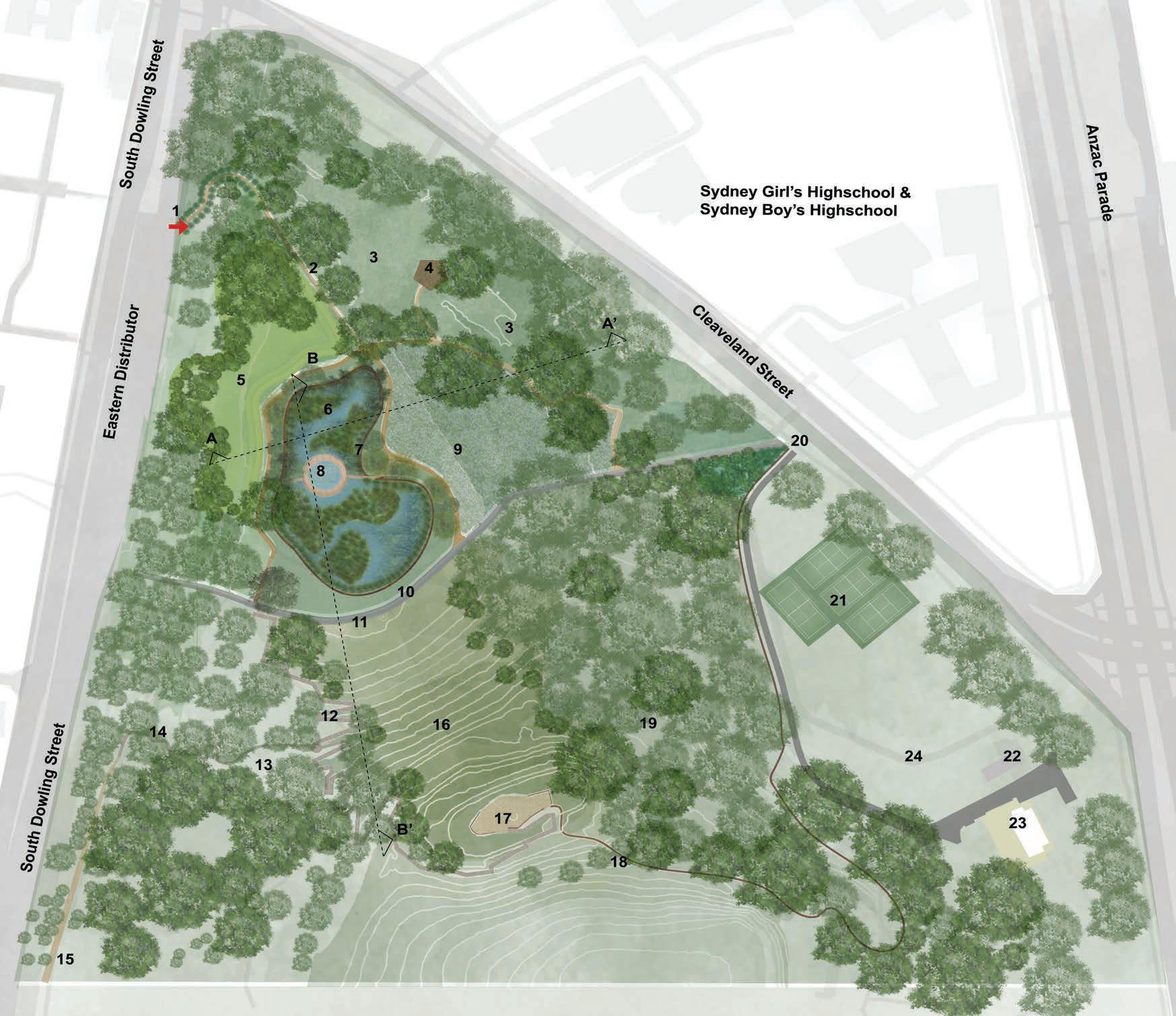 Main entrance is from the South Dowling Street as it is overlooking the suburbs: Surry Hills, Redfern and Waterloo in its proximity. Existing entrance connected with proposed circulation within the park. Existing bollards are retained and realigned to the path wherever necessary.