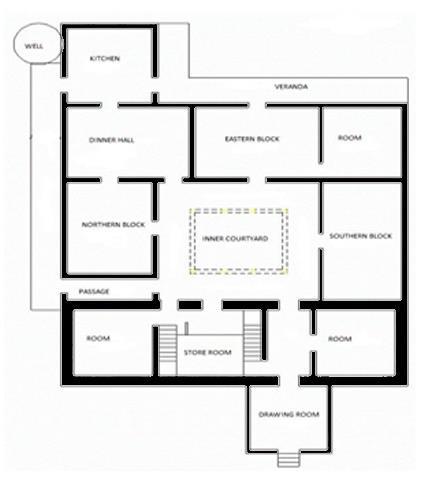 Built form: The plan form of the 'Haveli' is in the shape of trapezium, giving two long walls exposed.