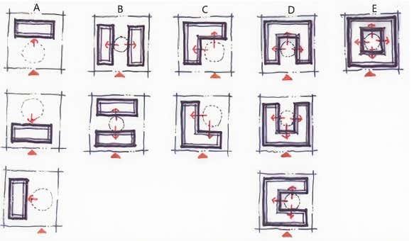 Figure 3.1 A. Single type B. Double line type C. L type D. U type E. Enclosed court type
