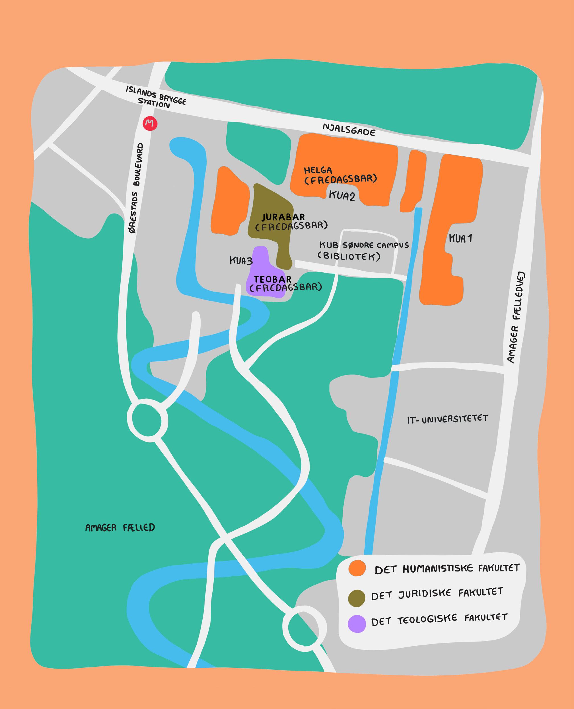 Frederiksberg, Nørre, City og Søndre. Det er de fire campusområder, som Københavns Universitet består af. Som studerende på KU vil du typisk have din daglige gang på ét, måske to, af dem. Men der er god grund til også at lære de andre campusområder – og de studerende der går der – at kende. Står du eksempelvis en fredag eftermiddag langt fra din egen studiecafe eller fredagsbar, men har brug for en billig øl eller sodavand? Så er der som regel en fredagsbar ved hånden alligevel. Eller har du onsdag morgen brug for lidt luftforandring med en anden læsesal? Så er der læsesale på alle fire campusområder. Det handler blot om at vide, hvor de befinder sig! På Københavns Universitet er alle studerende nemlig velkommen, og det gælder hele universitetet. Du må derfor godt sidde på en anden læsesal eller drikke kaffe i en anden studiecafe end den, der hører til dit studies campus. På næste side kan du se et overblik over, hvordan KU fordeler sig i byen, og på de efterfølgende sider et mere detaljeret overblik over hvert campusområde. Men, tænker du måske, hvad skal man dog bruge et gammeldags kort til, når man altid har Google Maps ved hånden? Vores forslag er, at du bruger de fire kort her i bogen som
