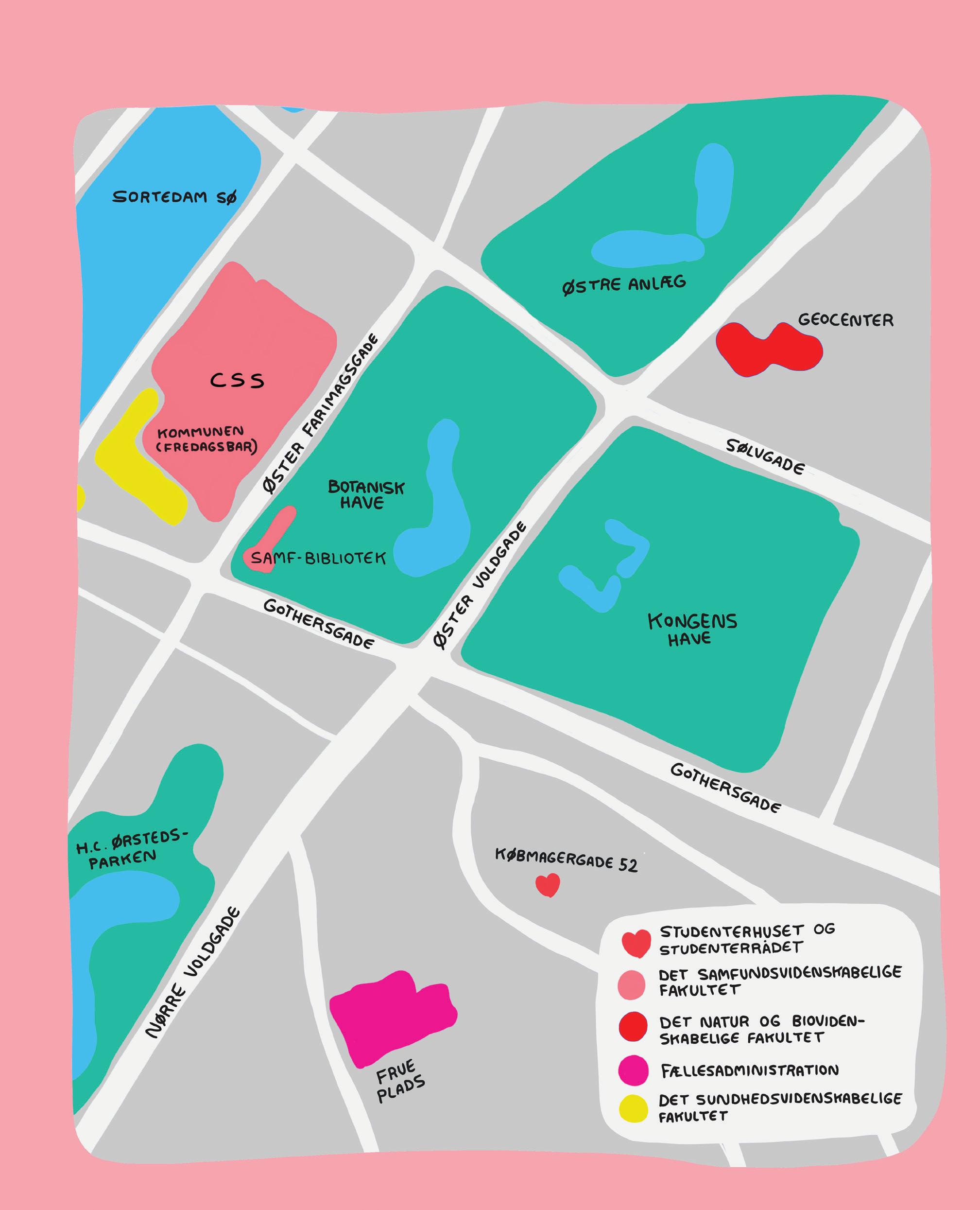 til Maps – som overblik over, hvordan KU specifikt fordeler sig i byen. KU har faktisk også bygninger uden for København – nemlig på Skovskolen i Fredensborg og på Djursland. De kræver dog et helt andet kort at have med her i bogen. På kortene har vi fremhævet KU’s bygninger i København og hvilket fakultet, de repræsenterer. På den måde kan du få en fornemmelse af, hvem der hører til hvor. Der er også skrevet nogle få læsesale og fredagsbarer ind. På den baggrund er opfordringen herfra simpel: Udforsk KU og udnyt at universitetet er fordelt over hele byen. På den måde er universitetets muligheder altid lige ved hånden!