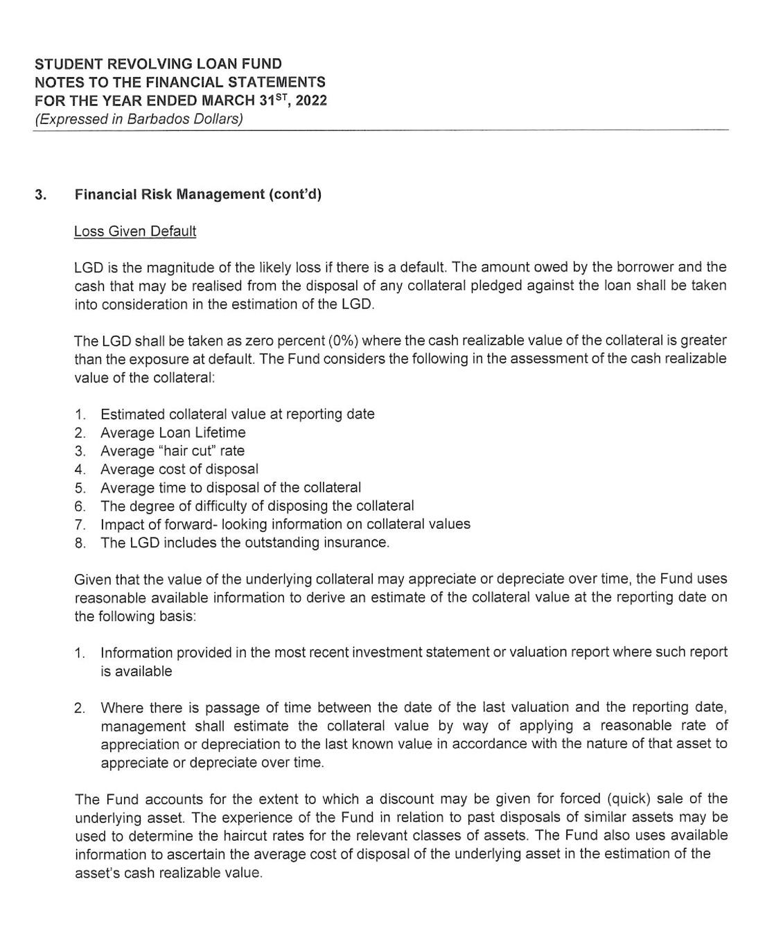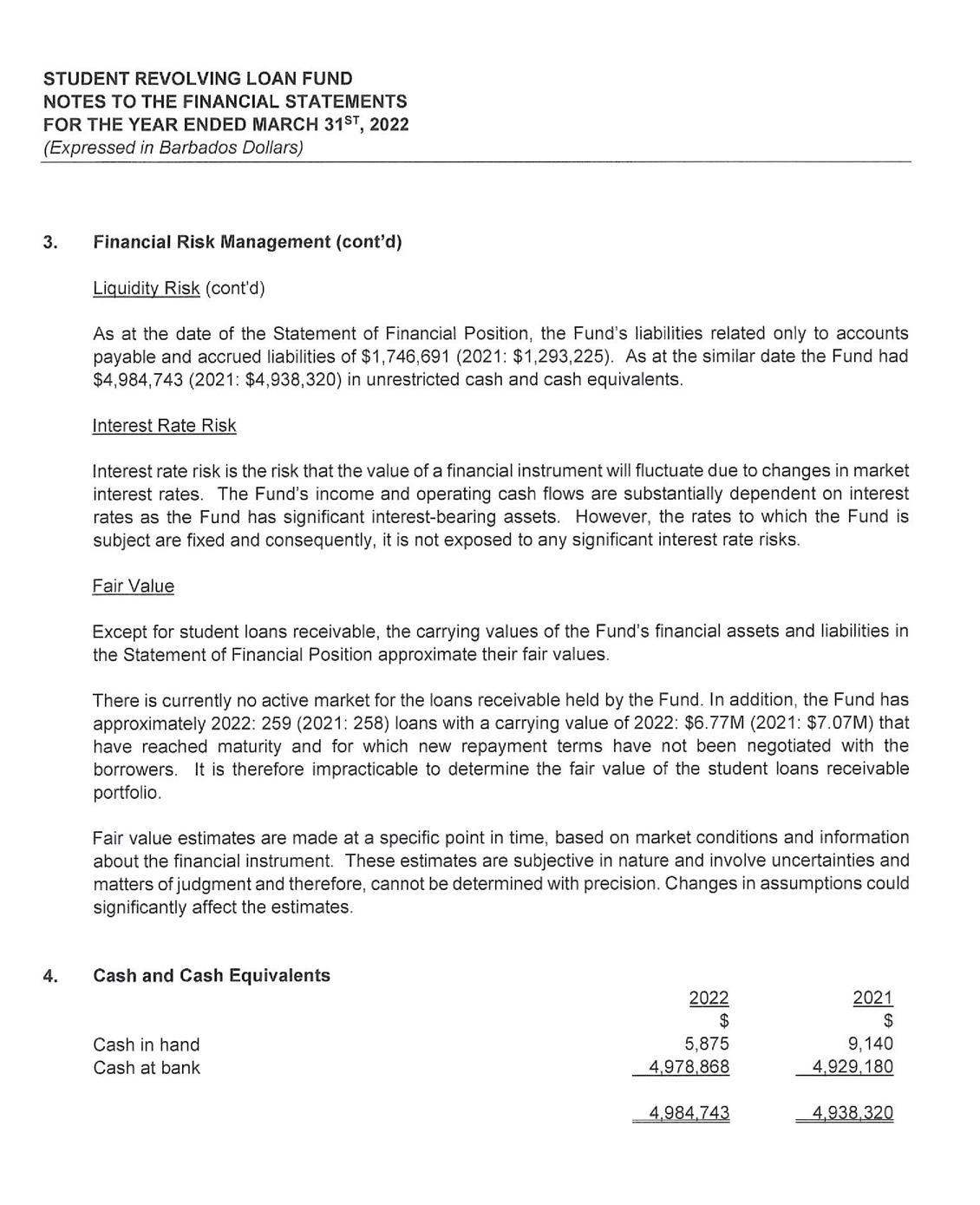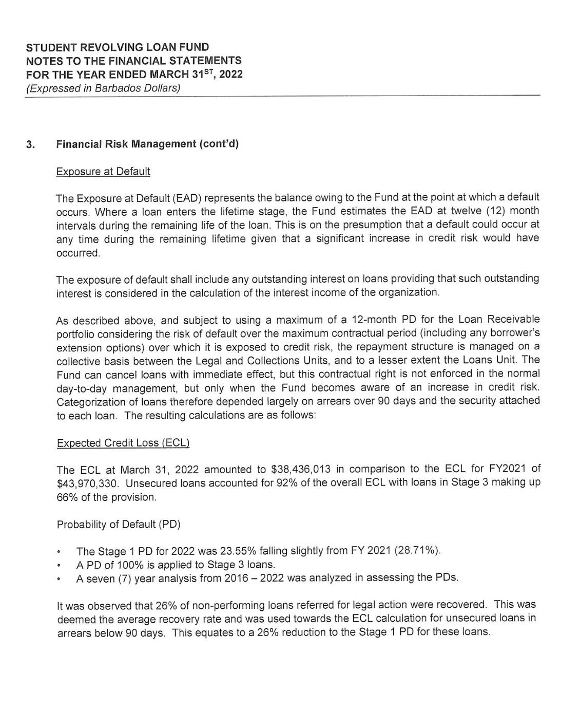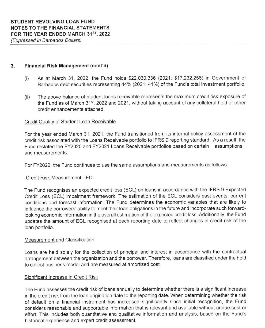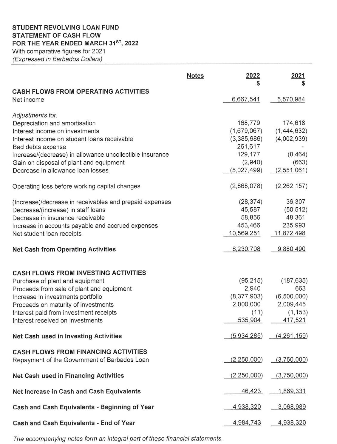 its investment portfolio of $50 million being its largest single asset. Despite the unfavorable economic environment receipts from the repayment of loans continue to hold steady at $17 million. As a consequence, the SRLF is well poised to continue to provide affordable financing to Barbadians who wish to pursue their educational goals.