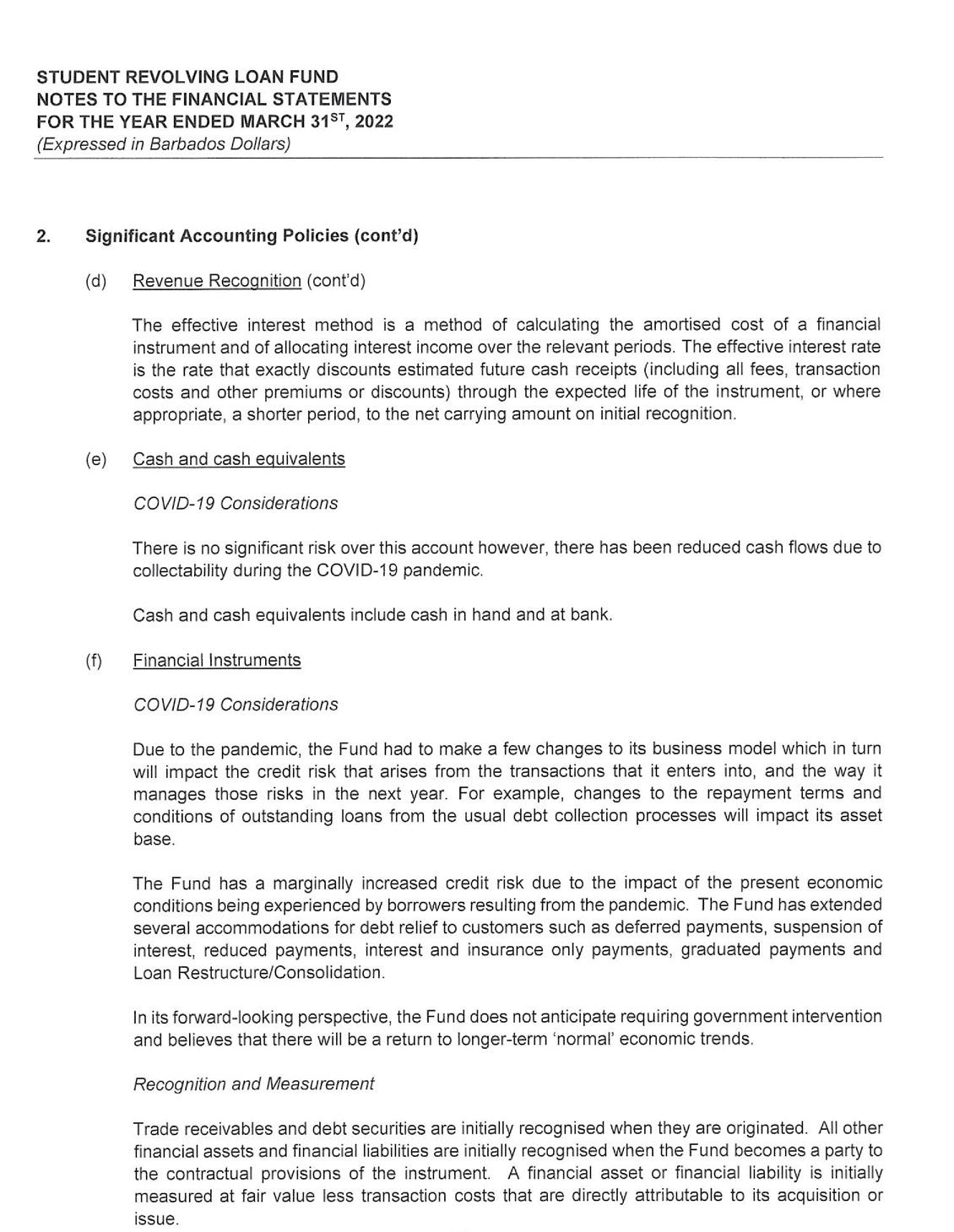Interest on student loans is expected to remain depressed over the next two to three years as the SRLF will be further impacted by the low level of loan approvals in prior years. These loans are now transitioning to the interest-bearing category of the loan portfolio. The low number of loan approvals over the previous three to four years combined with zero interest being charged during the initially agreed study period have contributed to a steady decline in loan interest income. To reverse this trend, the SRLF will have to be more aggressive in its advertising and marketing efforts to attract an increased demand for loans. In addition, it will have to increase its product offerings to entice a wider cross-section of the population to apply for loans from the SRLF.