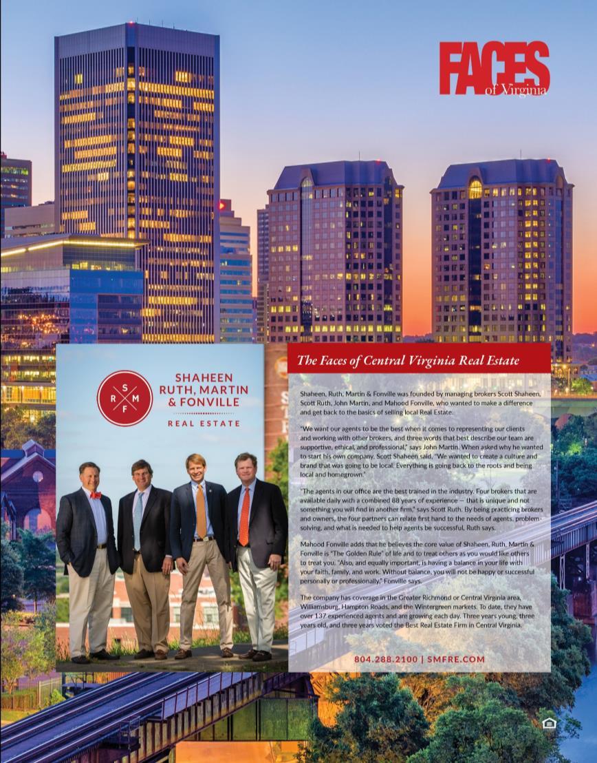 Shaheen, Ruth, Martin & Fonville was founded by four Managing Brokers, Scott Shaheen, Scott Ruth, John Martin, and Mahood Fonville, that wanted to make a difference and get back to the basics of selling local Real Estate. Their focus was on staying relevant and being ahead of the power curve when it comes to technology, marketing, and training in the Residential RealEstate Arena. "We want our agents to be the best when it comes to representing our clients and working with other Brokers, and three words that best describes our team are Supportive, Ethical, & Professional. " as stated by John Martin. When asked why he wanted to start his own company Scott Shaheen said, “We wanted to create a culture and brand that was going to be local! Everything is going back to the roots and being local and home grown”
