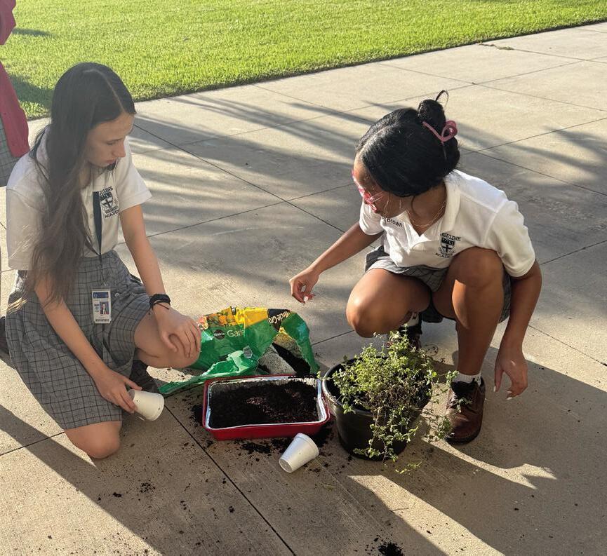Mrs. Christina Schlaudecker’s Adult Responsibility class has taken on a sustainability focus, inspired by Sister Francis Xavier Hebert, OSU who is remembered as the first female pharmacist in what would become the United States. With medical supplies scarce in colonial Louisiana, she cultivated an extensive herb garden at the Old Ursuline Convent. She used the plants to prepare teas, infusions, and remedies that helped treat the sick throughout the community.