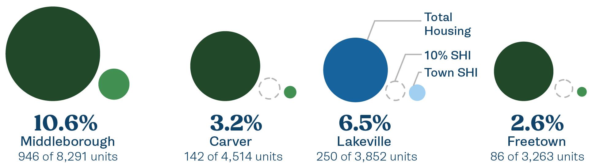 As of September 2023, the Town of Lakeville has 250 of its 4,382 Census 2020 year-round housing units listed on their Subsidized Housing Inventory, which does not meet the affordability requirements set forth in M.G.L. Chapter 40B §§ 20 through 23 and 760 CMR 56.00. This represents 5.71% of their total 10% Subsidized Housing Inventory requirement. Under these housing unit counts, Lakeville would need to produce at least 188 more affordable units
