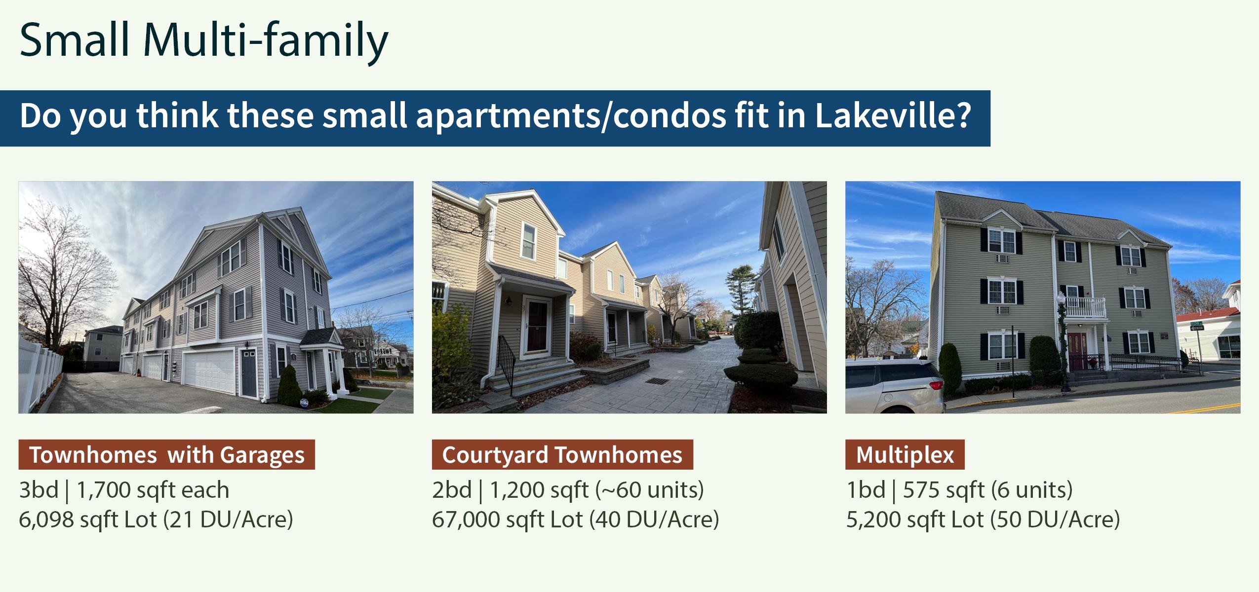 The project team met with Town staff and the Planning and Select Boards on numerous occasions. In addition to these meetings, the project team conducted a community survey to gauge local preferences and needs. The survey was open for one month and received 150 responses. We would like to thank those who took the time to engage with the project for their invaluable input, which has helped us shape this plan into an authentic and actionable list of goals and strategies for the Town of Lakeville.