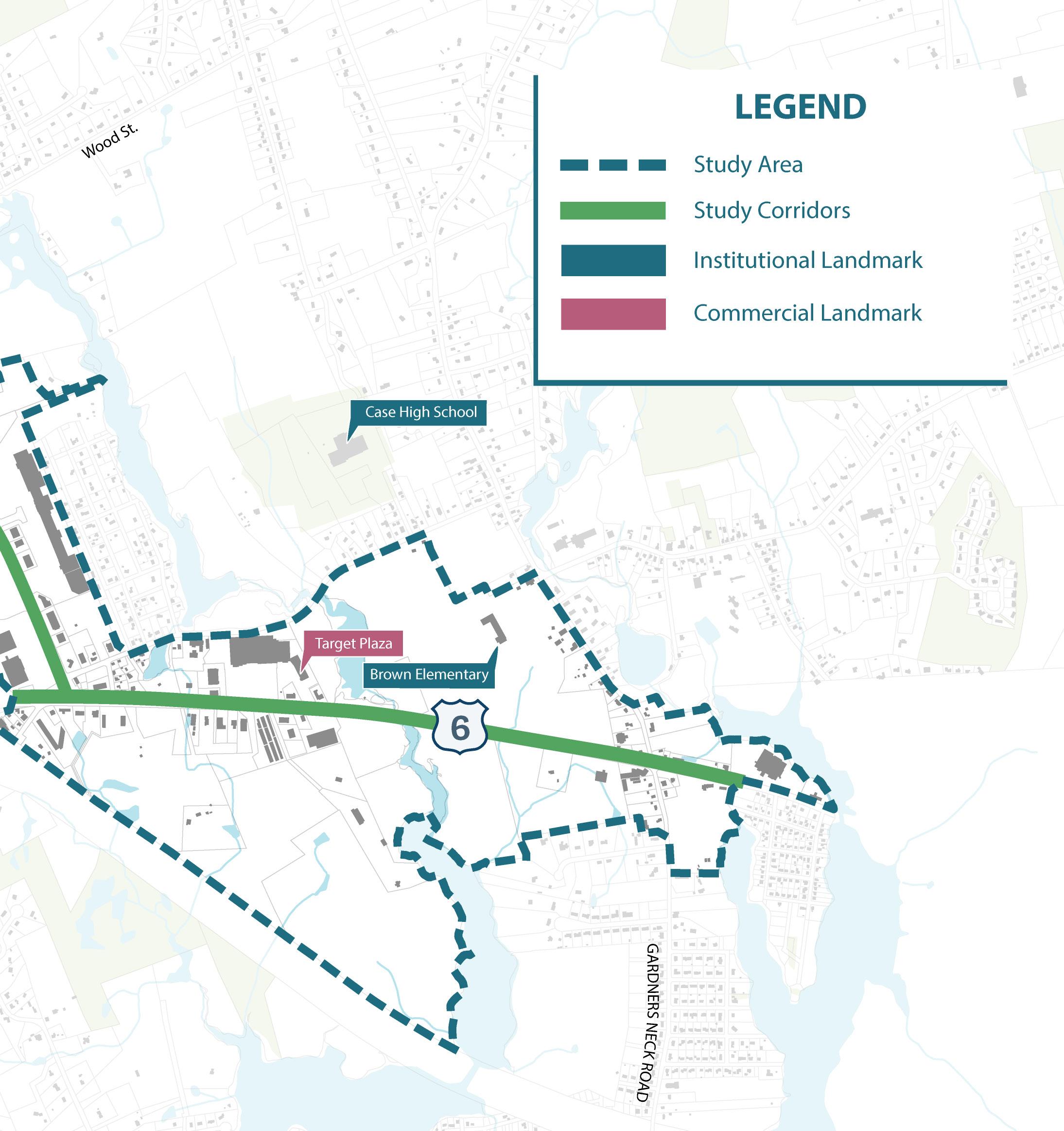 The study area consists of the commercial corridor that traverses Route 6 and Route 118. This project identifies an inventory of project-ready sites for redevelopment targeted for private-sector investment in industrial and commercial projects, while supporting the conversion of underutilized properties and obsolete facilities into modern, tax-generating uses.