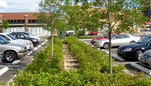 Parking lots should be appropriately vegetated, with a planting design that provides stormwater management and shade for vehicles and pedestrians. Strategic use of planting can also visually shield parking areas from the public right of way and to define pedestrian circulation, providing safe separation from vehicles.
