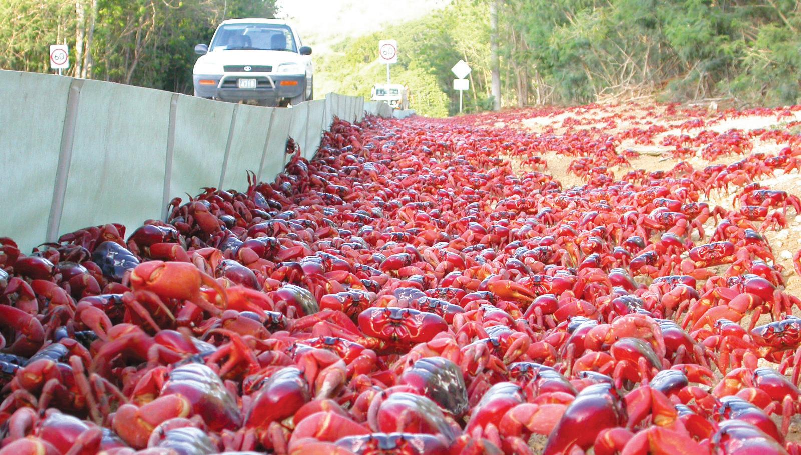 Svake godine, obi~no na po~etku ki{ne sezone, u oktobru ili novembru, po~iwe migracija crvenih kraba ka Bo`i}nom ostrvu, na australijskoj teritoriji, na 350 kilometara od indone`anske obale. Oko sto miliona rakova migrira iz svojih stani{ta u pra{umi ka pla`ama zbog mre{tewa.