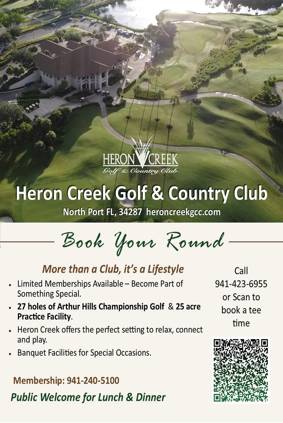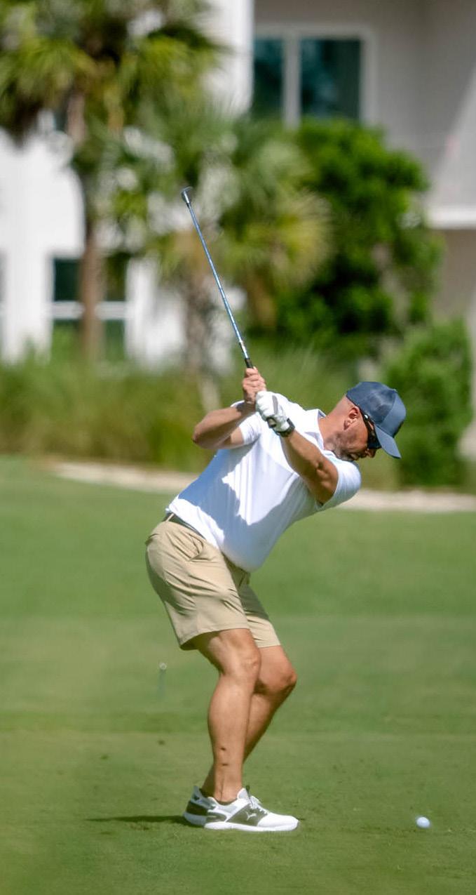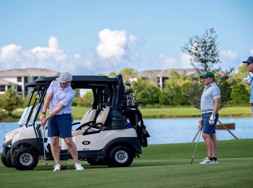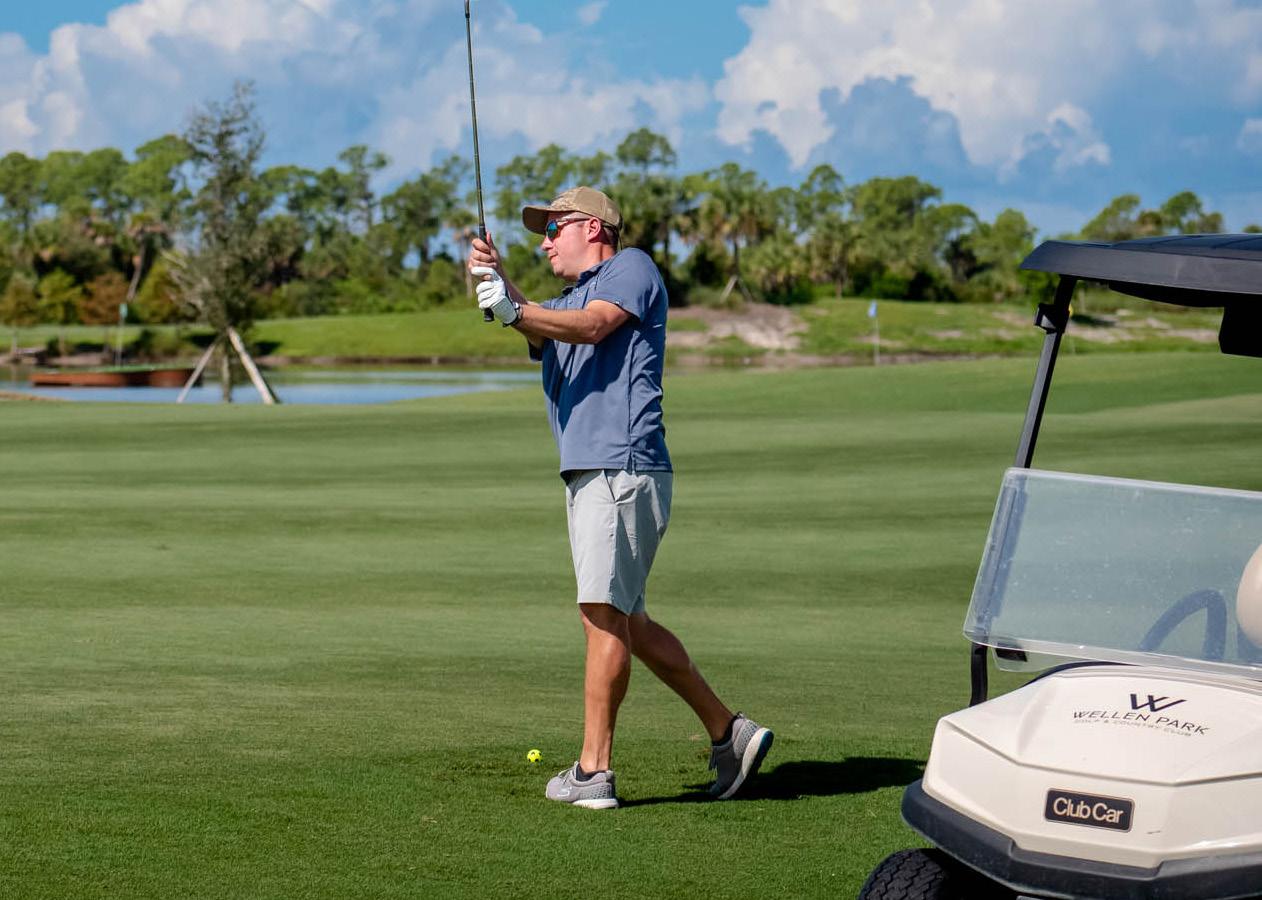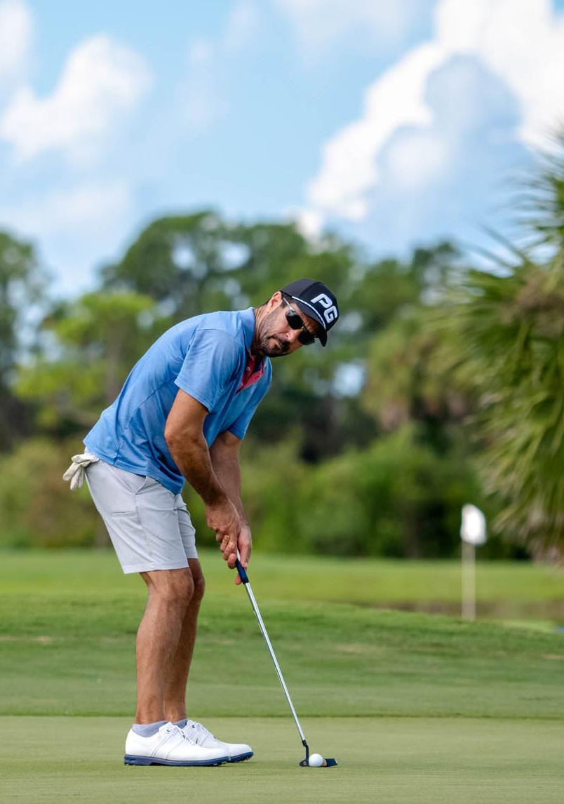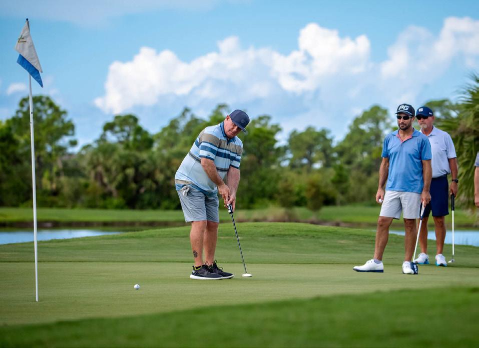 A golfer shows off textbook form on the fairway; Wellen Park Golf & Country Club’s tight fairways will test even the most skilled golfers; teams work the greens in a “scramble” format in which each golfer plays the team’s best ball on each hole.