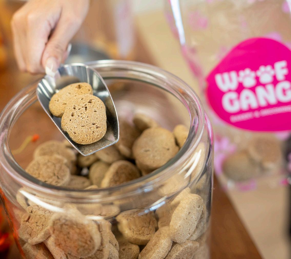 THIS SPREAD, LEFT TO RIGHT Club Pilates features a range of class offerings to challenge your body and mind. Visit Woof Gang for a paw-mazing selection of handmade, oven-baked treats, premium food and other pet essentials.