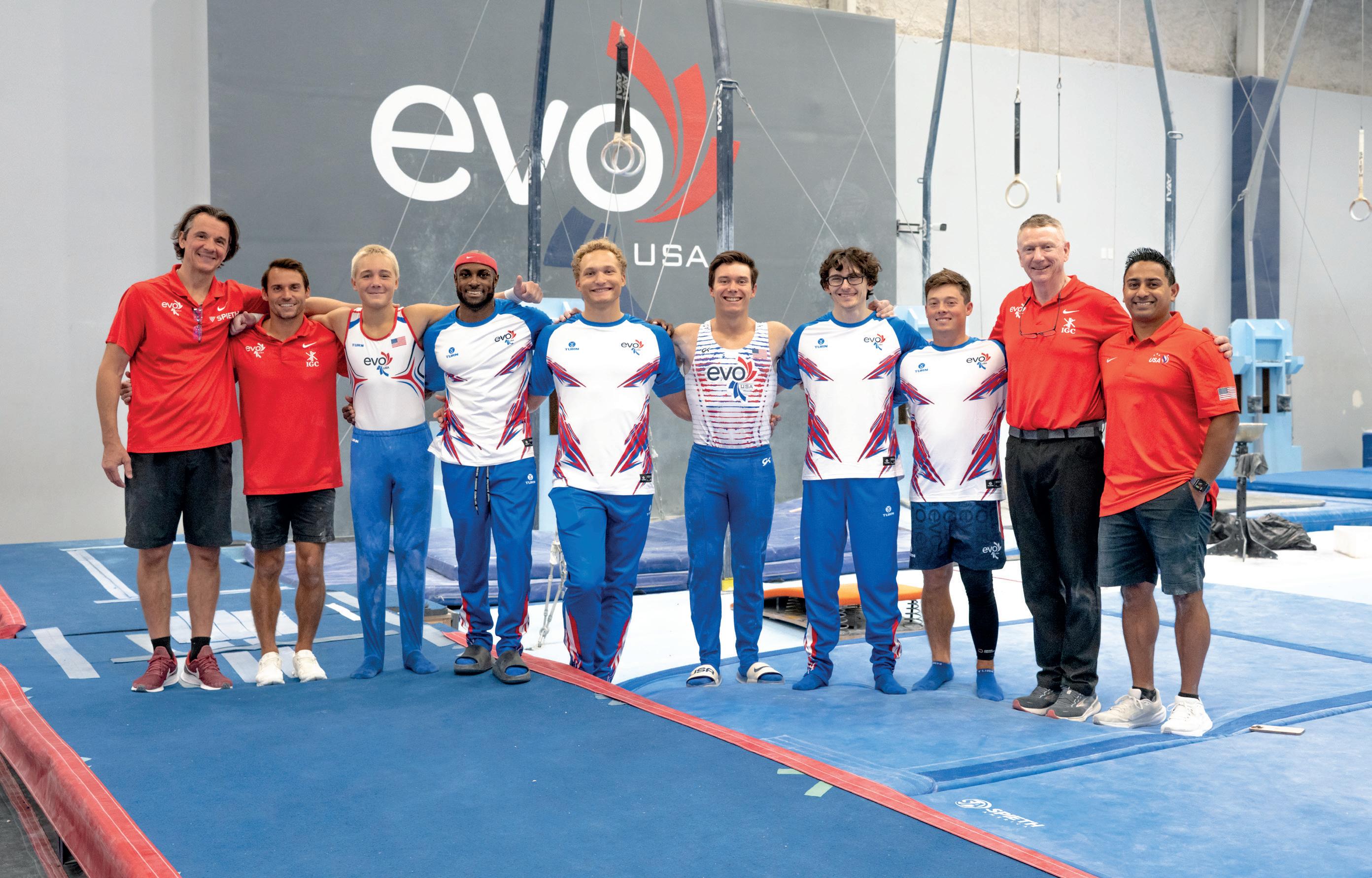 Below, left to right: Sergei Pakanich, Men’s Junior Elite Head Coach. Sam Mikulak, Men’s Team Coach. Danila Leykin. Donnell Wittenburg. Jackson Harrison, Recreational Coach. Brody Malone. Stephen Nedoroscik. Alex Diab. Kevin Mazeika, EVO Gymnastics Executive Director. Syque Caesar, Men’s Senior Elite Head Coach.
