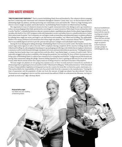 Zero-Waste Voyagers “RECYCLING IS NOT ENOUGH.” That’s a mantra Rethinking Plastic lives and breathes by. The volunteer-driven campaign has been connecting with restaurants and consumers throughout Sarasota County since 2017 on the hot-button issue of eliminating single-use plastics, and thus protecting our coastal land, ocean and marine life. “There is a huge learning curve when it comes to single-use plastic and its alternatives,” say Rethinking Plastic founders Cat Dillard and Jana Hoefling. The organization’s team of volunteers donates its time to guide restaurants both in the dining-in and to-go transition to reduce excess packaging in their daily operations by converting to eco-smart resources. With a hyper-focus on items they refer to as the “bad five”—clamshell polystyrene takeout containers, plastic cups/lids/straws, plastic bottles, plastic bags and plastic utensils—the BadFive Free (BFF) program works with businesses to source and utilize more eco-minded solutions to combat their carbon waste footprint. “As a community, we can begin to make an immediate and substantial impact on plastic pollution by refusing these single-use items, and begin to use alternatives and reusables,” say Dillard and Hoefling. The applaudable BadFive Free stamp celebrates local restaurants that refuse single-use plastic. When a restaurant obtains “BFF” recognition, they’ve successfully figured out how to provide patrons with options to mitigate each individuals’ waste footprint. Among the local dining spots taking advantage of Rethinking Plastic’s services is Leaf & Lentil. The family-owned, fastcasual vegan eatery signed on early to become #BFF compliant—having completed all five stars by working closely with Dillard and Hoefling. By only using plant-based/paper to-go packaging and offering cooler drinks that are in glass or aluminum containers, Leaf & Lentil eliminated all single-use plastic serveware and materials within its operations. “Finding alternatives to plastic has been harder than I ever expected but worth the effort,” says Sheila Siegel, co-owner of Leaf & Lentil. “We’ve especially struggled with product availability a bit during this pandemic, but watching The Story of Plastic documentary and being a part of Rethinking Plastic’s coalition has committed us to trying that much harder.” Indigenous and Blu Kouzina are among other restaurants taking the pledge. Sarasota Sailing Squadron is close to gaining its fifth star for its on-site social events, while MADE and the former 1812 Osprey made are working toward eco-alternatives for three of the BadFive. “Because single-use plastics are not going away anytime soon, we have recently started to research two methods of eliminating it that are gaining traction around the world,” Dillard and Hoefling say. “EPR and incineration.” EPR (Extended Producer Responsibility) legislation is being used across the country for items like car batteries, paint, mattresses, etc. This method shifts the responsibility of the end of an article’s life from the consumer to the manufacturer. “During the time of quarantine and the popularity of take-out food, the amount of single-use plastic has skyrocketed,” they say. “Restaurants are struggling to survive and the environment has suffered. While we understand the dilemma, we hope to get back on track soon.” SRQ —Brittany Mattie