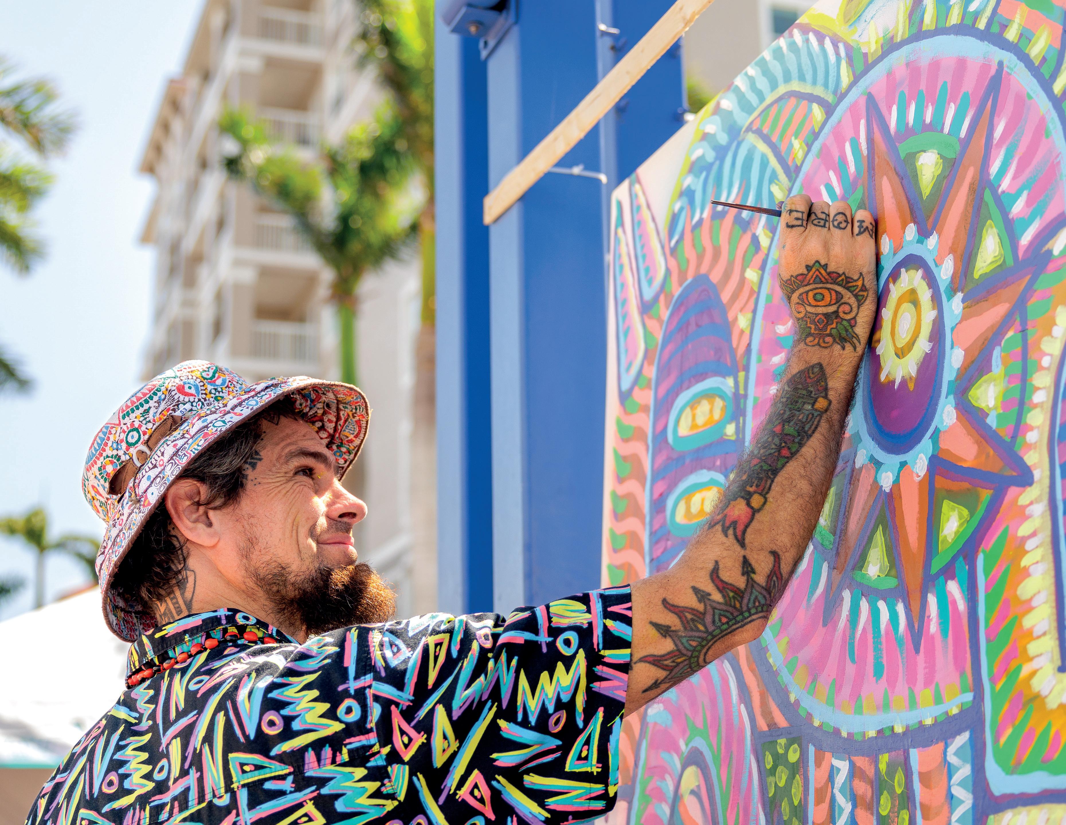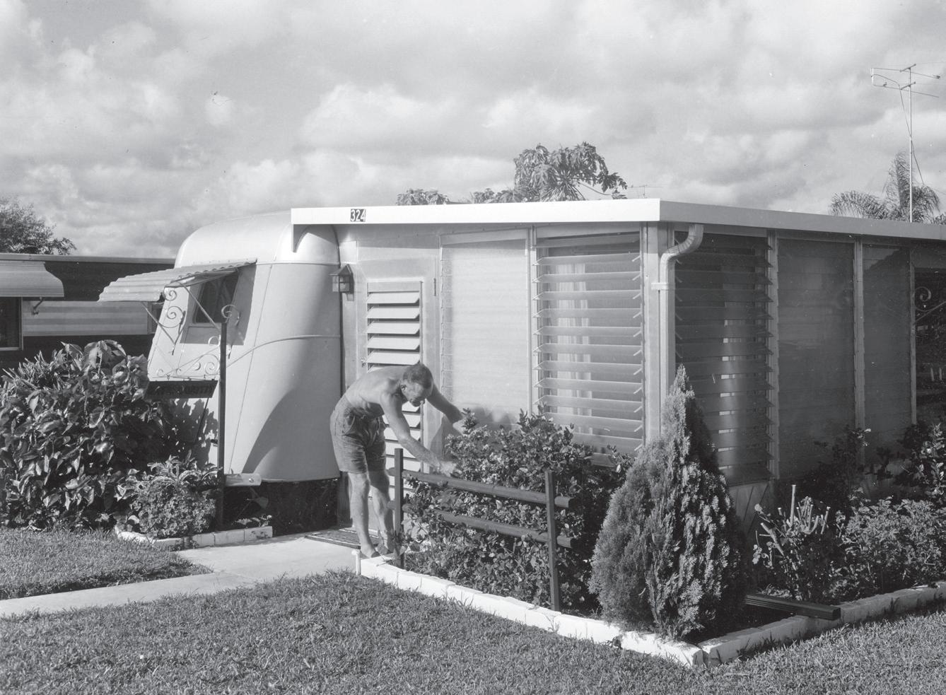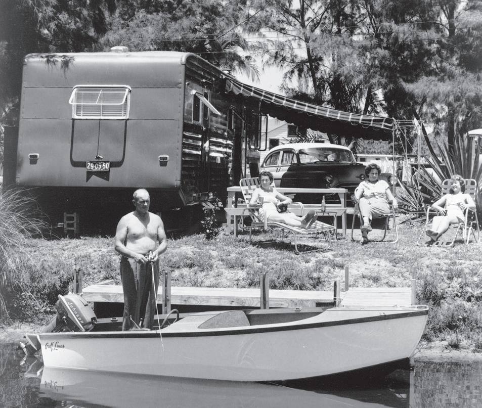This page, clockwise: Artist Keenan Perren, Mariscos Azteca, photography by Wes Roberts. Steinmetz, Joseph Janney, Man fishing from boat at a Venice trailer park. 1953. State Archives of Florida, coutesy of Architecture Sarasota.