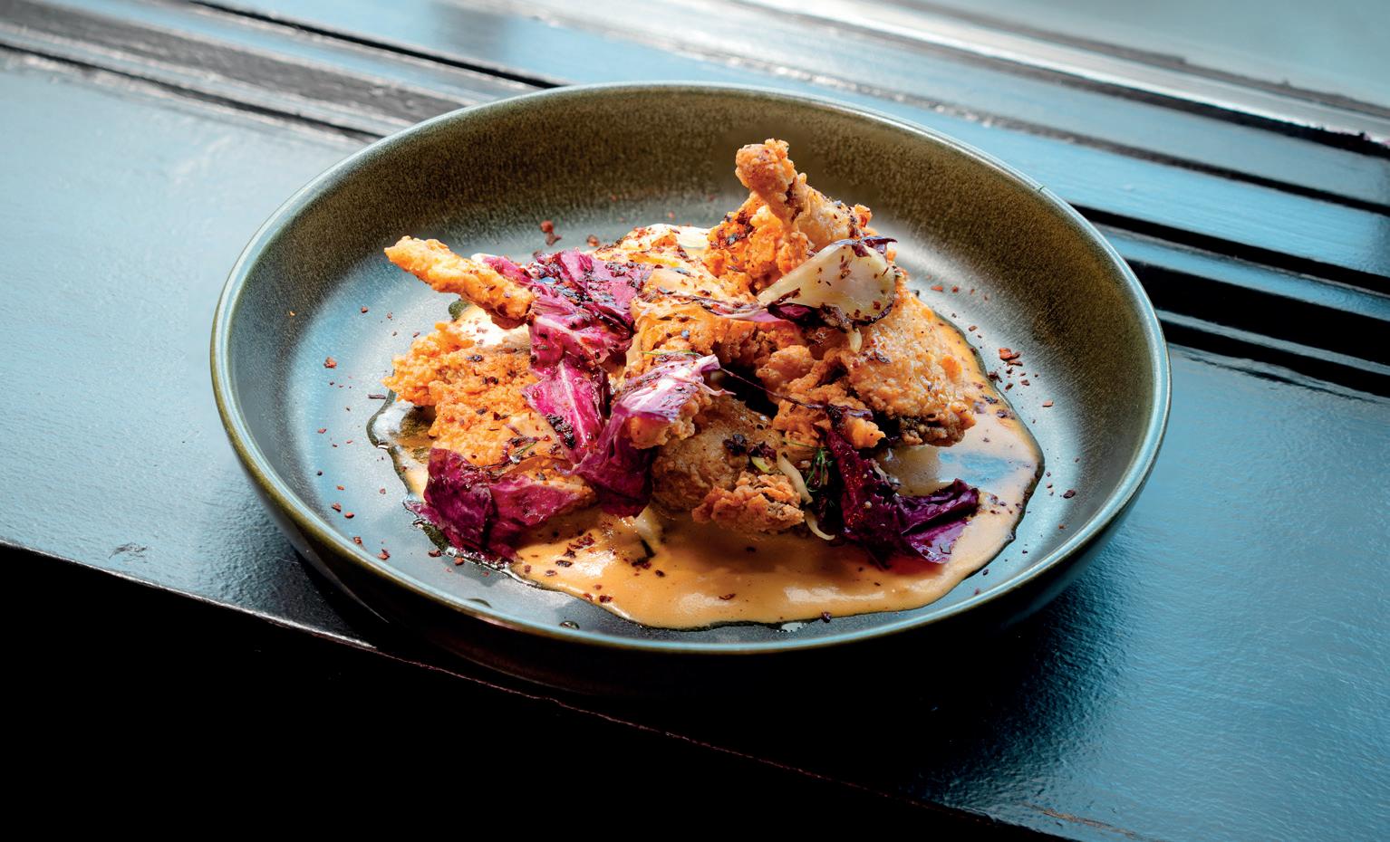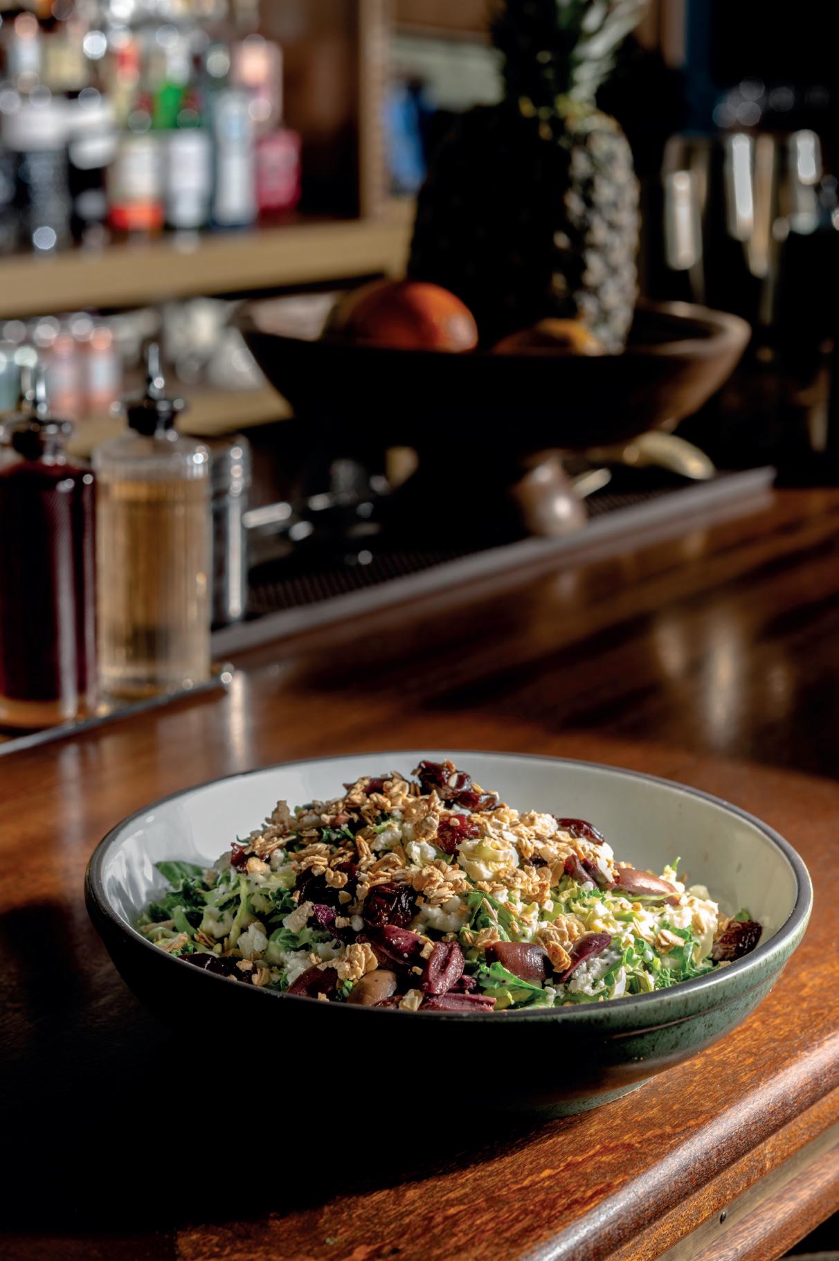 smiles today.” The Steak by the Ocean arrives with slices of grilled beef fanned atop Arcadian blend lettuce, roasted pecans and dried cranberries. Avocado and red onion glisten with champagne vinaigrette. Perch at the small bar, watch the game and order the steak as you prefer—even rare, the way Bourdain would. Grilled pita makes scooping each bite easy. Co-workers linger at al fresco cafe tables, tucking into chicken chilaquiles; families settle into booths for French toast beneath exposed ductwork. Forked’s adventurous but approachable salads might accompany a breakfast crepe or stand alone for lunch. By 7pm, those same diners appear at Allswell gastropub with permission to indulge. Sipping house-crafted cocktails, they declare steak on iceberg a proper dinner. The 60-degree Wedge delivers: draped in applewood-smoked bacon, crumbled blue cheese and chopped chives, a balsamic drizzle awaiting crisp valleys. Tender slices of petite filet mignon skirt alongside. Art Deco meets mid-century modern: a long wood bar, tufted leather banquettes, gilded ceiling coffers floating above saturated teal walls. Bottles of liqueur glow behind glass like an apothecary. Or choose the Tavern Salad: shredded kale and shaved Brussels cradling kalamata olives, crumbled feta, drunken cherries,