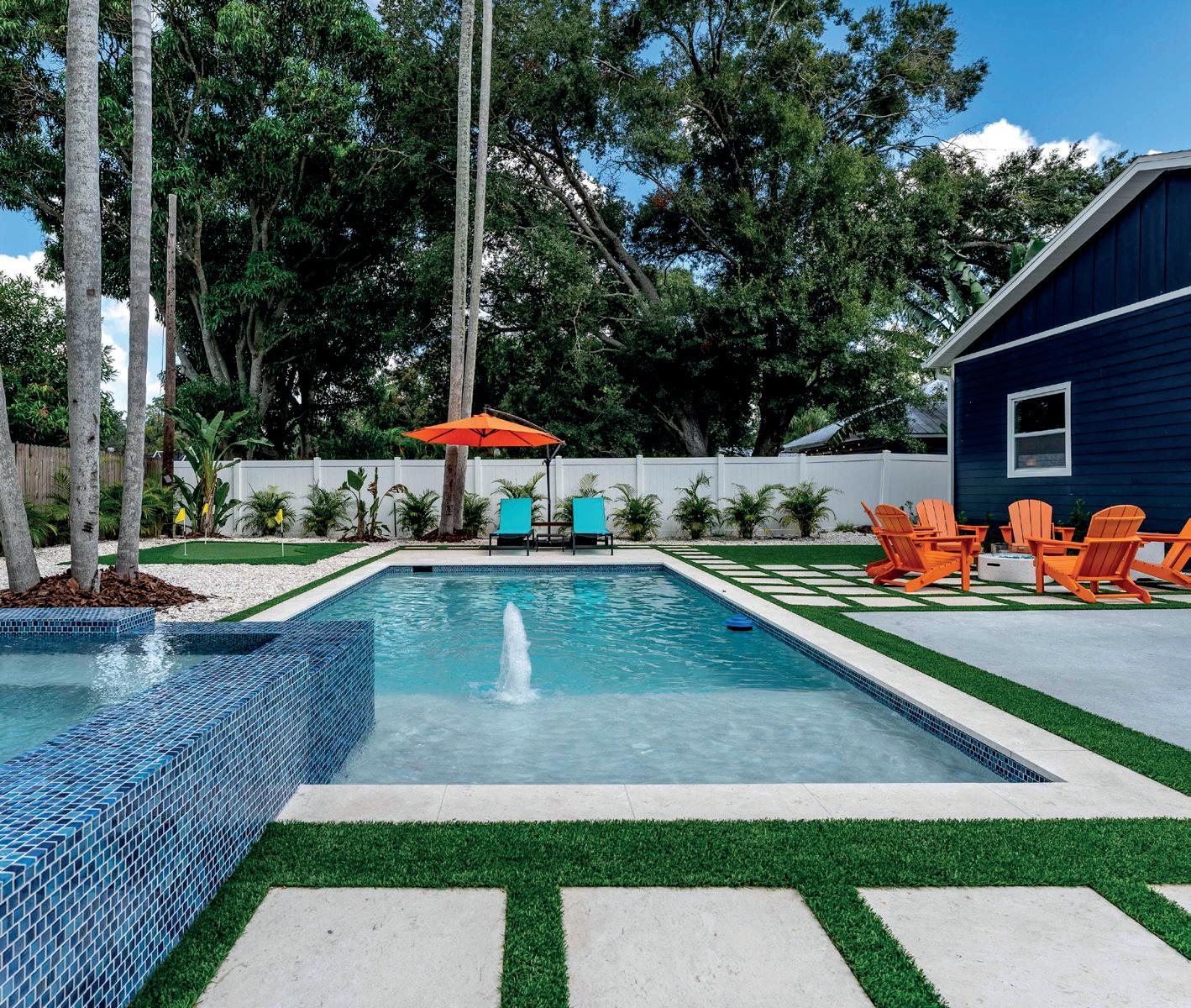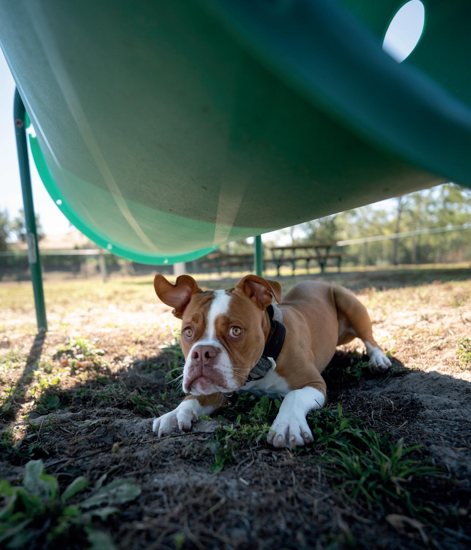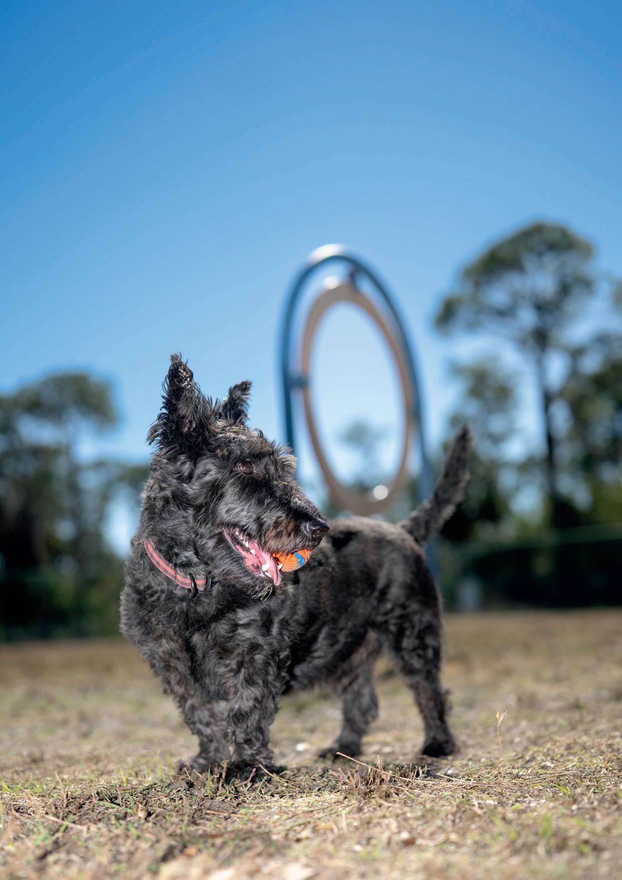 park’s standout features is its dedicated dog area, a place for pets to run, play and socialize. Set within a spacious, fenced-in section of the park, the Greenbrook Adventure Dog Park is thoughtfully designed with separate areas for large and small dogs, allowing pets to burn energy safely. Water stations and shaded seating make it comfortable for both dogs and their owners, while agility equipment adds an extra element of play and challenge. The atmosphere of the park is just as much about community for owners as it is for dogs—meeting other regulars while dogs enjoy time playing provides the opportunity for social gatherings. Whether it’s a spirited round of fetch or a laid-back chat on a bench, the dog park provides a vibrant destination for local visitors. Beyond its fencedin dog park, the adventure park’s trails and open green spaces invited leashed dogs and humans to explore together. Greenbrook Adventure Park, 13010 Adventure PI, Lakewood Ranch