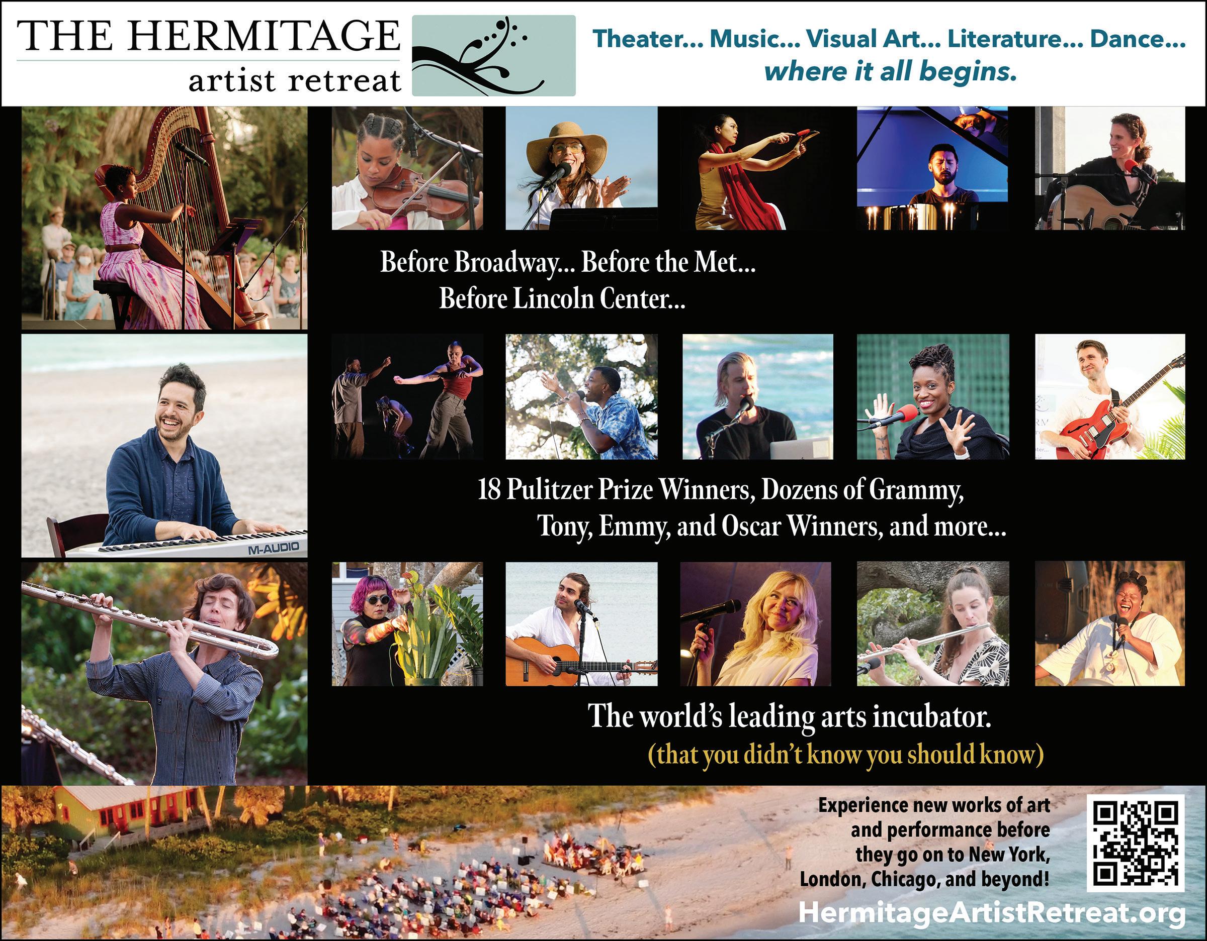 what their work wants to become. Its reputation as one of the most respected arts development organizations in the United States is indisputable. Each year, nearly 100 world-renowned artists grace our Gulf Coast community. Hermitage Fellows have included 18 Pulitzer Prize winners; Tony, Oscar, Emmy, and Grammy winners and nominees; MacArthur and Guggenheim Fellows; Poets Laureate; and some of the most influential creative voices defining the arts today. The work they develop on Manasota Key goes on to reach audiences in major theaters, concert halls, and museums around the world. Cultural leaders from across the globe view the Hermitage as the place