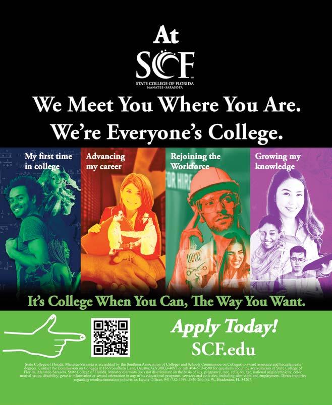 State College of Florida, Manatee-Sarasota (SCF) boldly leading in its community and in the rapidly changing higher education landscape. Following strategic priorities for opportunity, growth, quality and diversification, SCF works with community partners to meet the region’s workforce needs. As an open-access and studentfocused institution, SCF provides flexible scheduling, convenient options for in-person or online learning, affordable tuition, and success coaches who provide academic and career guidance. Financial assistance in the form of scholarships, grants, federal financial aid and payment plans remove barriers to attaining a degree.