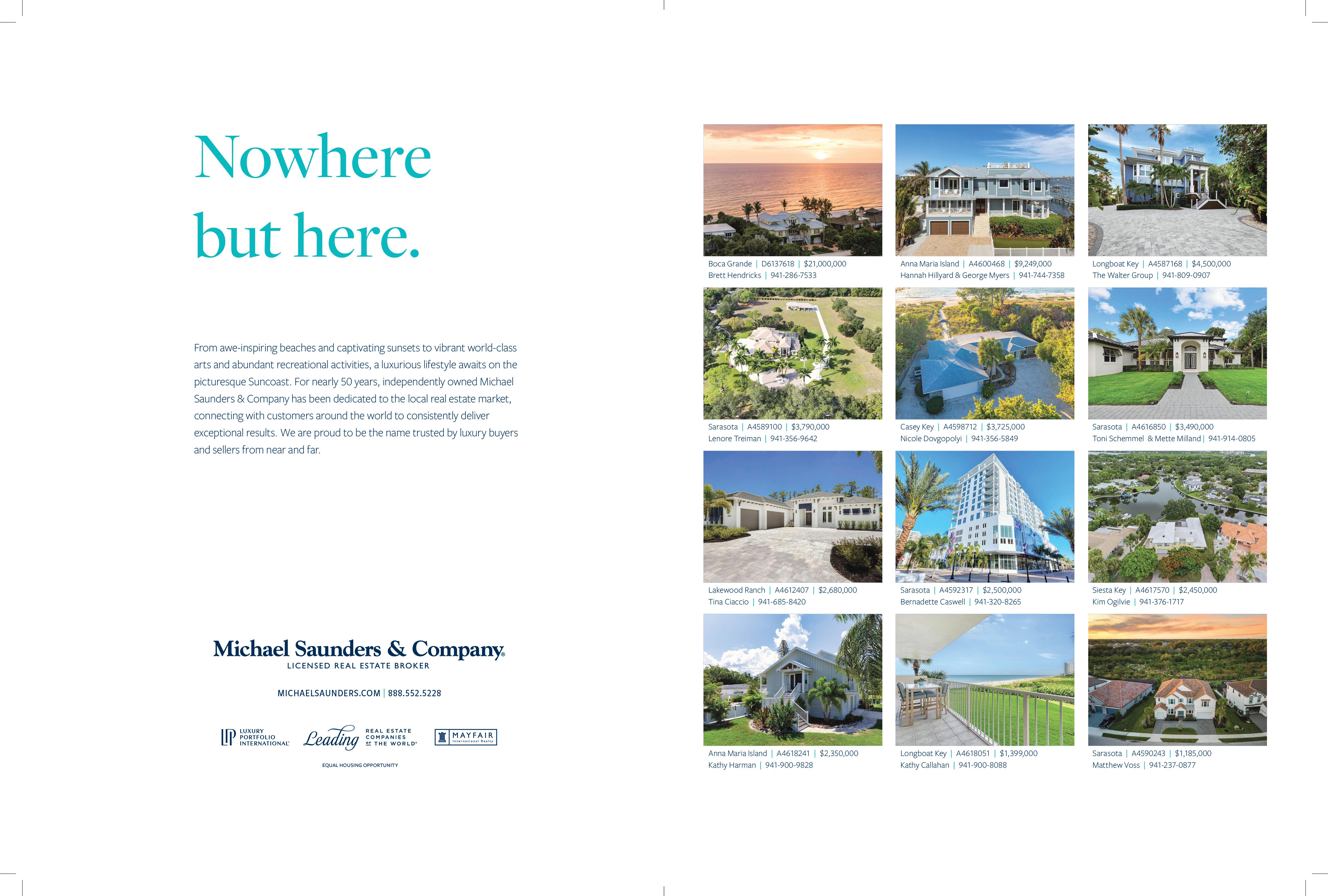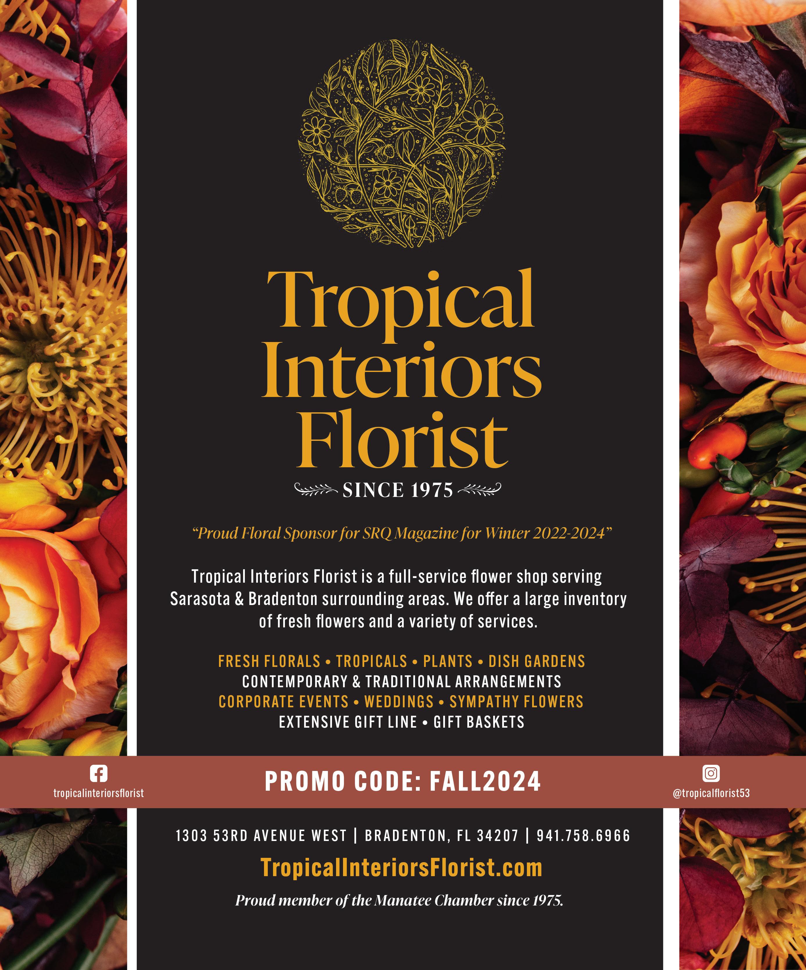 SUBSCRIBE TO THE PRINT AND DIGITAL EDITION Join our readers in the pleasurable experience of receiving SRQ magazine in your mailbox every month during season and bimonthly during the summer. To reserve your subscription, provide your information and payment online. You can set up multiple addresses, renewals and special instructions directly through your online account. When you subscribe online, your first print issue will arrive in your mailbox in 6-10 weeks. Subscribe online at SRQMAG.COM/SUBSCRIBE. Contact us via email at subscribe@srqme.com