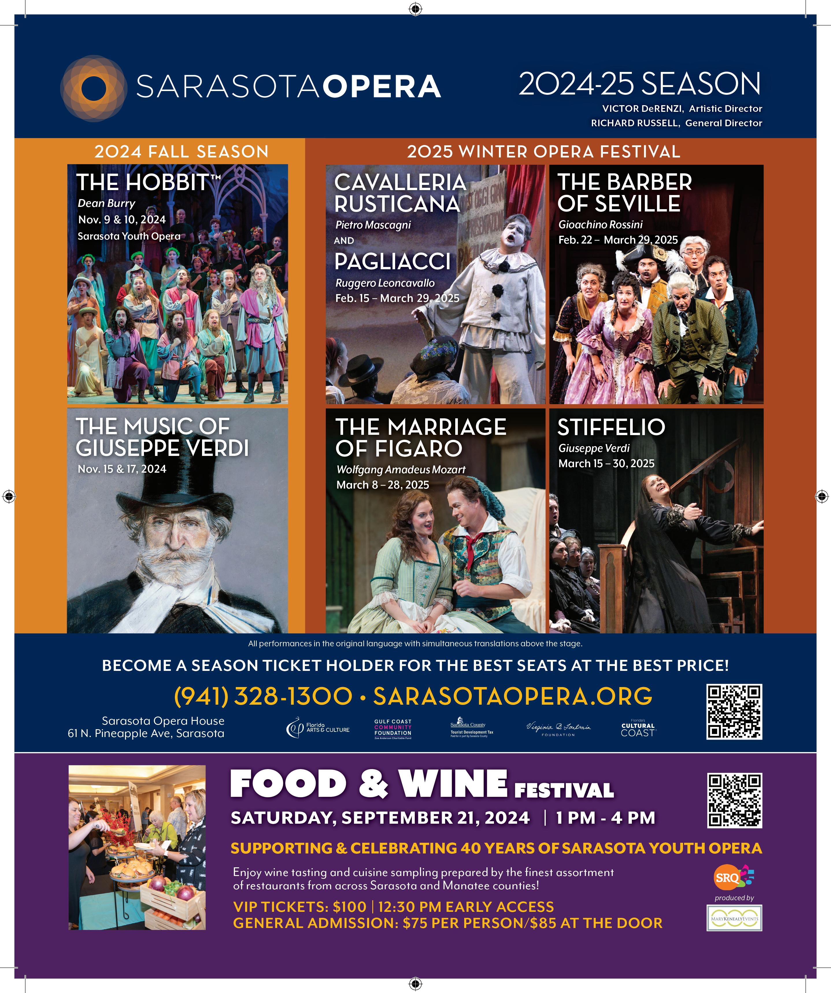 From dramatic performances to comedies and musicals, from beautifully-detailed paintings to custom-designed crafts, our community has no shortage of cultural happenings and SRQ has the arts beat covered. With live performances and exhibitions taking place throughout the county, we have all you need to be a part of Sarasota’s very vibrant 2024-2025 arts scene.