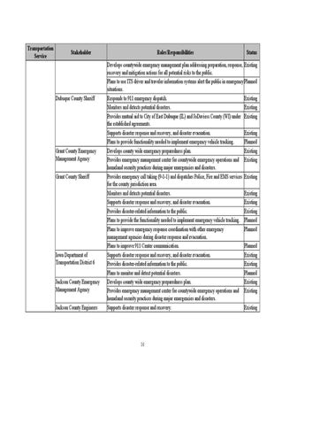 Develops countywide emergency management plan addressing preparation, response, Existing recovery and mitigation actions for all potential risks to the public. Plans to use ITS driver and traveler information systems alert the public in emergency Planned situations. Responds to 911 emergency dispatch. Existing Monitors and detects potential disasters. Existing Provides mutual aid to City of East Dubuque (IL) and JoDaviess County (WI) under Existing the established agreements. Supports disaster response and recovery, and disaster evacuation. Existing Plans to provide functionality needed to implement emergency vehicle tracking. Planned Develops county wide emergency preparedness plan. Existing Provides emergency management center for countywide emergency operations and Existing homeland security practices during major emergencies and disasters. Provides emergency call taking (9-1-1) and dispatches Police, Fire and EMS services Existing for the county jurisdiction area. Monitors and detects potential disasters. Existing Supports disaster response and recovery, and disaster evacuation. Existing Provides disaster-related information to the public. Existing Plans to provide the functionality needed to implement emergency vehicle tracking. Planned Plans to improve emergency response coordination with other emergency Planned management agencies during disaster response and evacuation. Plans to improve 911 Center communication. Planned Supports disaster response and recovery, and disaster evacuation. Existing Provides disaster-related information to the public. Existing Plans to monitor and detect potential disasters. Planned Develops county wide emergency preparedness plan. Existing Provides emergency management center for countywide emergency operations and Existing homeland security practices during major emergencies and disasters. Supports disaster response and recovery. Existing