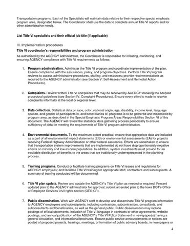 III. Implementation procedures Title VI coordinator’s responsibilities and program administration As authorized by the AGENCY Administrator, the Coordinator is responsible for initiating, monitoring, and ensuring AGENCY compliance with Title VI requirements as follows. 1. Program administration. Administer the Title VI program and coordinate implementation of the plan. Ensure compliance with the assurances, policy, and program objectives. Perform Title VI program reviews to assess administrative procedures, staffing, and resources; provide recommendations as required to the AGENCY administrator (see Section V: Self-Assessment and Remedial Action Procedures). 2. Complaints. Review written Title VI complaints that may be received by AGENCY following the adopted procedural guidelines (see Section IV: Complaint Procedures). Ensure every effort is made to resolve complaints informally at the local or regional level. 3. Data collection. Statistical data on race, color, national origin, age, disability, income level, language spoken, and gender of participants in, and beneficiaries of, programs is to be gathered and maintained by program area, as described in the Special Emphasis Program Areas Responsibilities Section VI of this document. The AGENCY will review the statistical data gathering process periodically to ensure sufficiency of data for meeting the requirements of Title VI program administration. 4. Environmental documents. To the maximum extent practical, ensure that appropriate data are included as a part of all environmental impact statements (EIS) or environmental assessments (EA) for projects receiving Federal Highway Administration or other federal assistance. Efforts are undertaken to ensure that transportation system improvements that are implemented do not have disproportionately negative effects on minority and low-income populations. In addition, system investments must provide for an equitable distribution of benefits to the areas that are traditionally underrepresented in the planning process. 5. Training programs. Conduct or facilitate training programs on Title VI issues and regulations for AGENCY employees; and facilitate Title VI training for appropriate staff, contractors and subrecipients. A summary of training conducted will be documented. 6. Title VI plan update. Review and update the AGENCY’s Title VI plan as needed or required. Present updated plan to the AGENCY administrator for approval; submit amended plan to the Iowa DOT's Office of Employee Services' civil rights section (OES-CR). 7. Public dissemination. Work with AGENCY staff to develop and disseminate Title VI program information to AGENCY employees and subrecipients, including contractors, subcontractors, consultants, and subconsultants and beneficiaries, as well as the general public. Public dissemination may include postings of official statements, inclusion of Title VI language in contracts or other agreements, website postings, and annual publication of the AGENCY’s Title VI Policy Statement in newspaper(s) having a general circulation, and informational brochures. Ensure public service announcements or notices are posted of proposed projects, hearings, meetings, or formation of public advisory boards, in newspapers or