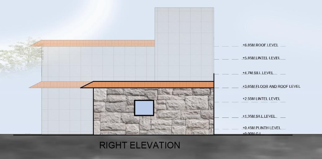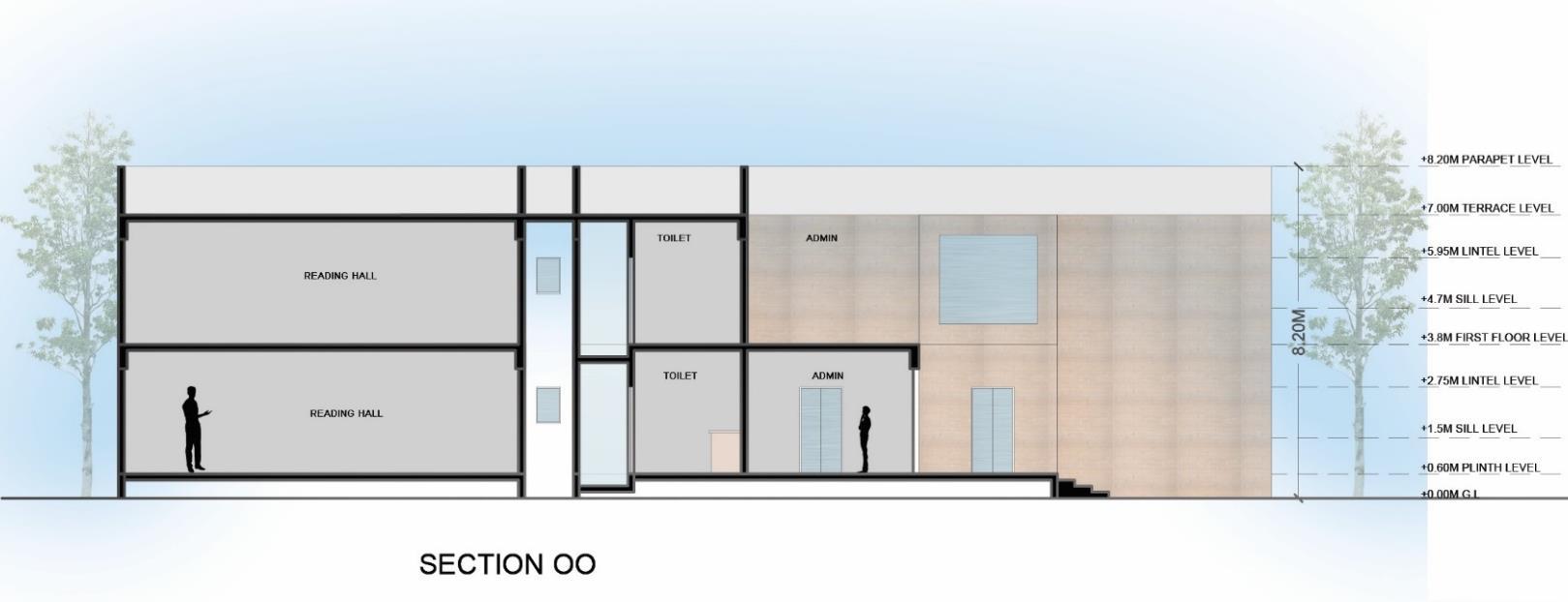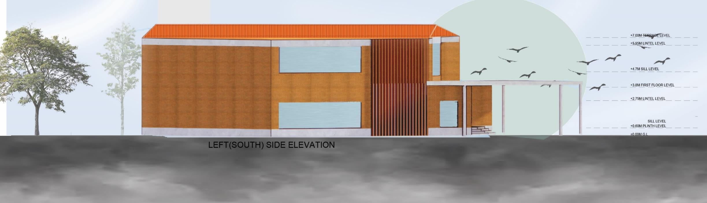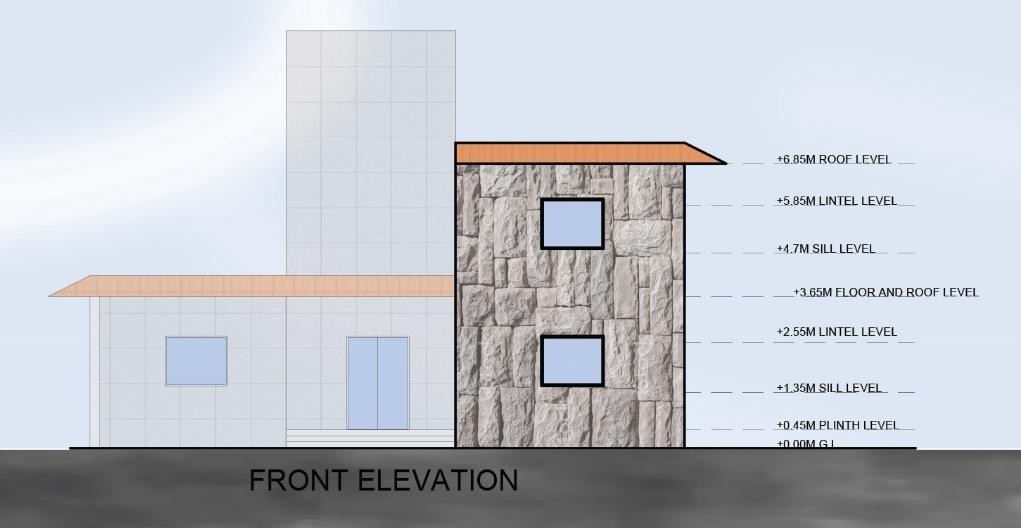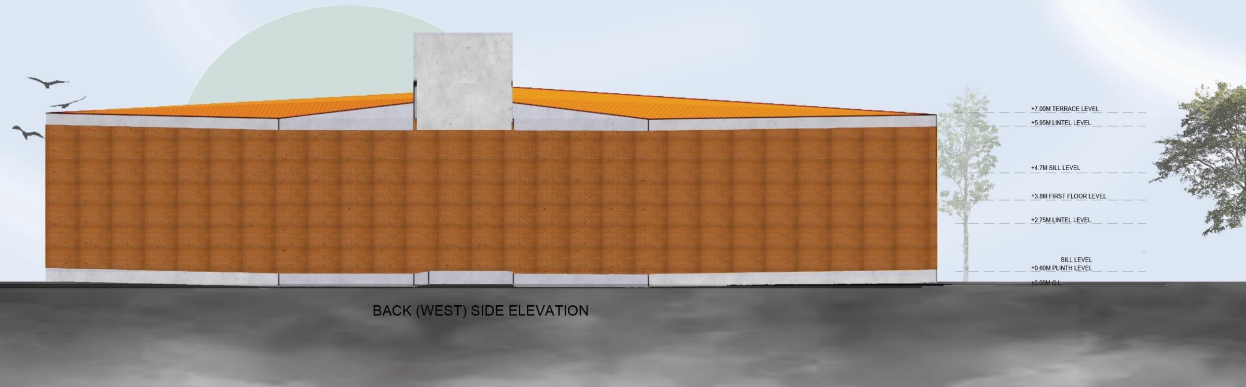 Conventional local materials like brick and stone provide the building earth, with a grounded feel that blends it with its surroundings The walls of an administrative block are made with brick masonry having brick cladding Random rubble stonework is used at end of each wing with concrete jaali