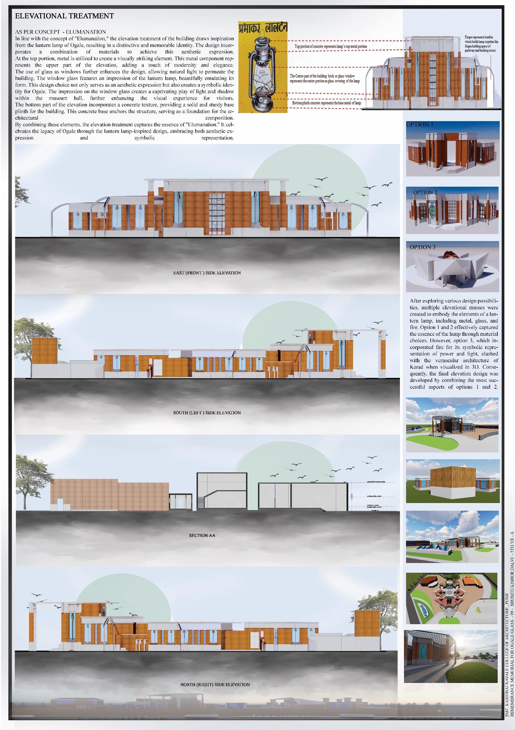 the architectural concept, representing enlightenment, a sense of remembrance and identity of ogale creation It may serve as a focal point or a recognizable feature in the design, conveying an important message as remembrance of ogale famous and valuable product during swadeshi movement Emulation refers to the act of imitating or replicating something, often to match or surpass its qualities or characteristics It involves striving to achieve a similar outcome or result as the original, either by closely following its methods or by attempting to capture its essence Top portion of concrete represents lamp’s top metal portion Bottom plinth concrete represents the base metal of lamp The Centre part of the building brick or glass window represents the centre portion as glass covering of the lamp Finges represents handles which holds lamp together like finges holding space of pathway and building intact. Emulating a lanten lamp to create aesthetic expression and symbolic identity of ogale in the window which will reflect external light beautifully inside the museum hall OPTION 1 OPTION 2 OPTION 3 OPTION 4