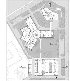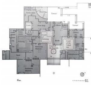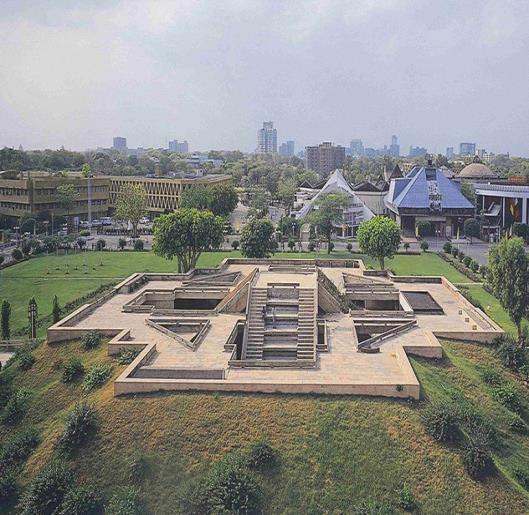 The concept is inspired by the idea of 'non-building': only a glimpse of the structure is seen from the entrance as if there is no building at all Due to the sloping terrain, the building unfolds itself when one walks in gradually leveling down Series of courts and terrace gardens are inspired by an Indian village setting which brings together nature, culture and architecture in harmony