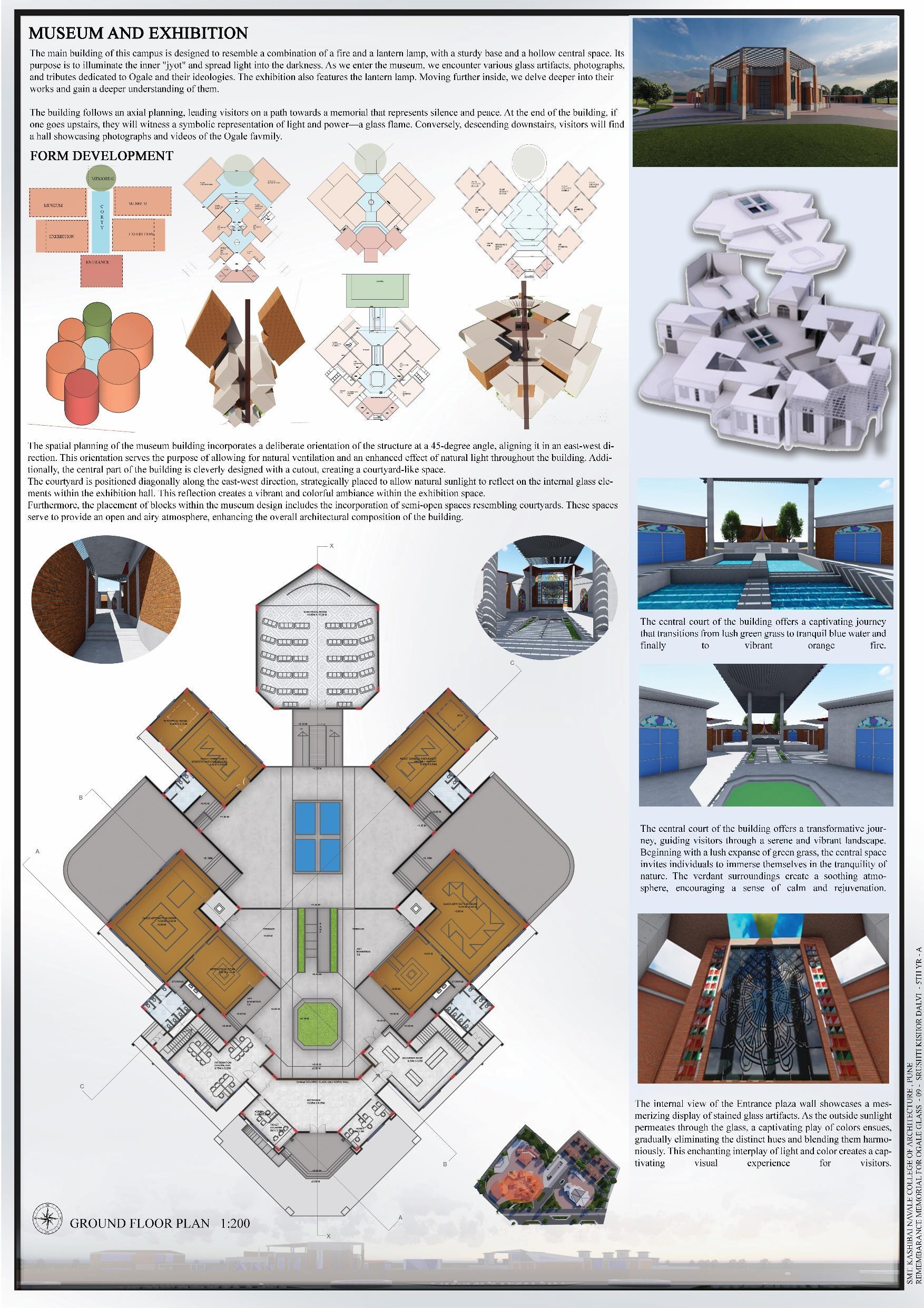 1.Lighting and Illumination: The word "Lanten" could be derived from "lantern," suggesting a focus on lighting and illumination within the building It will emphasis on creating unique lighting arrangements, creating a specific ambiance, or incorporating innovative lighting for museum space 2.Aesthetic Expression: The Ogale Lanten Lamp signify a distinctive aesthetic language or design element in materials that is metal represent as concrete and glass represent as brick and glass façade