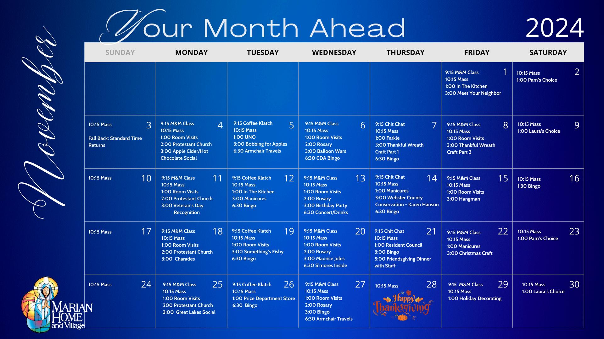 WelcometoNovember,themonthofgivingthanks Thisyearseemstohavejustflownbyandnowit’stimetoenjoysome coolerweatherandsomehotdrinks.Applecider,hotchocolate,s’moresinsideareonthecalendar.Standardtimereturns onSundaythe3rdsoremembertosetyourclocksbackonehour.WearehappytoannounceProtestantChurchServicesare onceagainweekly!ItiseveryMondayat2:00p.m.inourbeautifulchapel.WewillhaveCDABingoonthefirstWednesdayof themonth.WewillrecognizeourVeteransonthe11th.KarenHansonfromWebsterCountyConservationwillbeherewitha presentationonthe14th.MauriceJuleswillbeheretosingforusonthe20th.AFriendsgivingDinnerwithresidentsand staffisplannedforthe21st.ThePrizeStoreisonthe26th.HappyThanksgivingtooneandallonthe28th.Asalways,ifyou haveanyquestions,suggestionsorwanttoreserveaspotforgettingtogetherwithyourlovedonepleasegiveusacallor sendanemail.