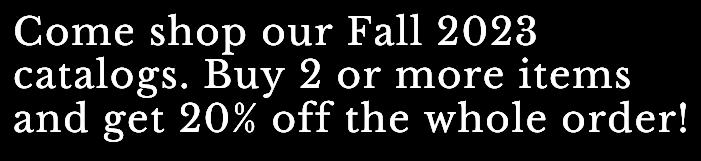 For May and June, if you come shop our Fall 2024 catalogs and buy 2 or more items, we will give you 20% off the whole order! Just email kearp@sulphurspringscc com to set up a time